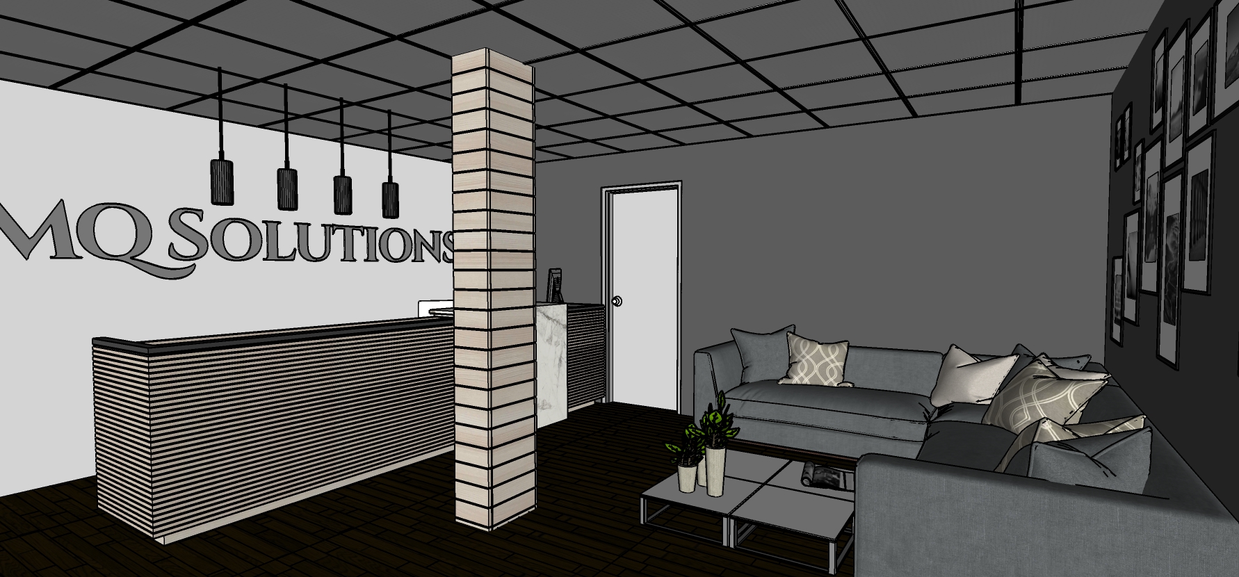 add 4 white baseboards on the bottom of the walls add 2x2 led acoustic ceiling lights add daylight coming from the windows that are located on the other side of the room in the opposite side of the entrance door