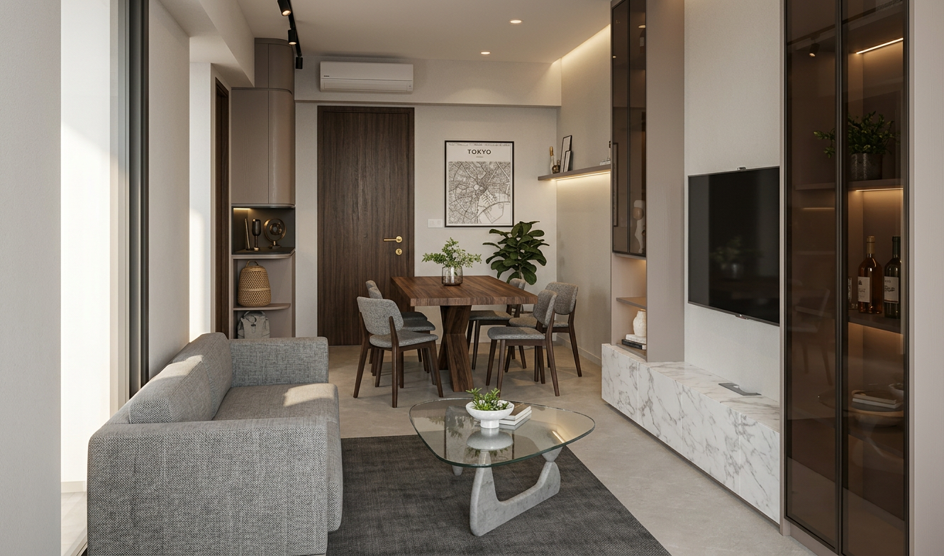 colours and wood texture to remain accurate as per original photo wood texture in subtle grains carpentry in muted mid dark taupe with subtle wood grains showcase glass cabinet in dark brown tinted glass
