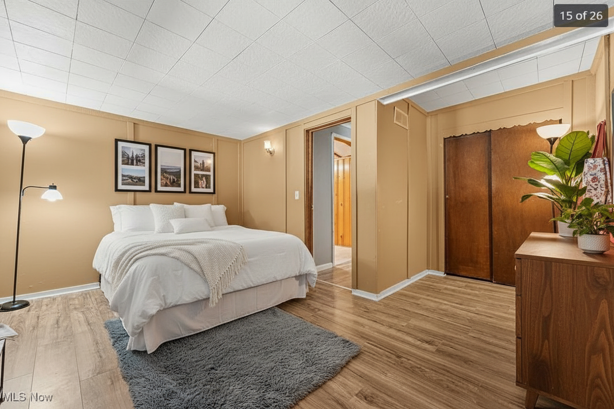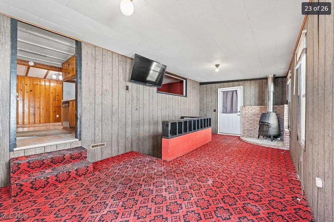 remove the wood burning stove replace the red carpet with typical white square tiling add a rug and sunroom furniture with plants paint the block wall white
