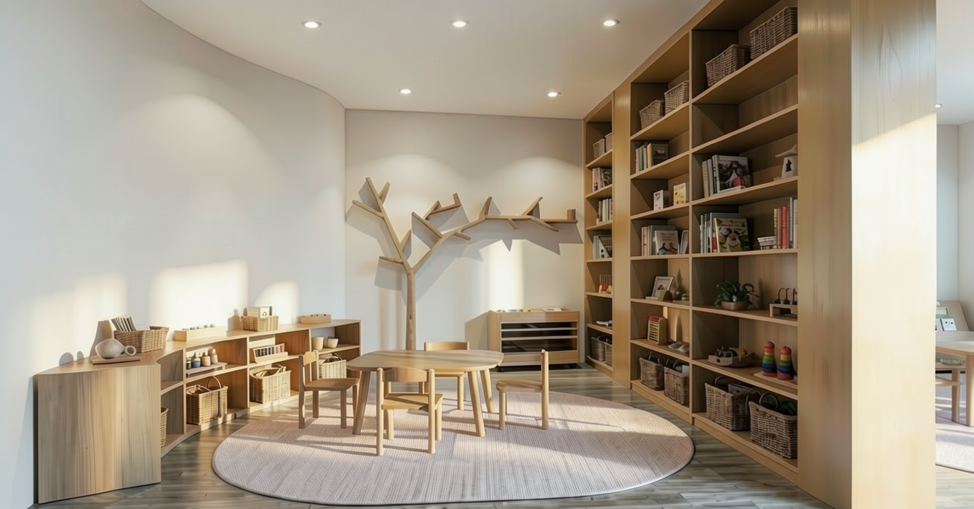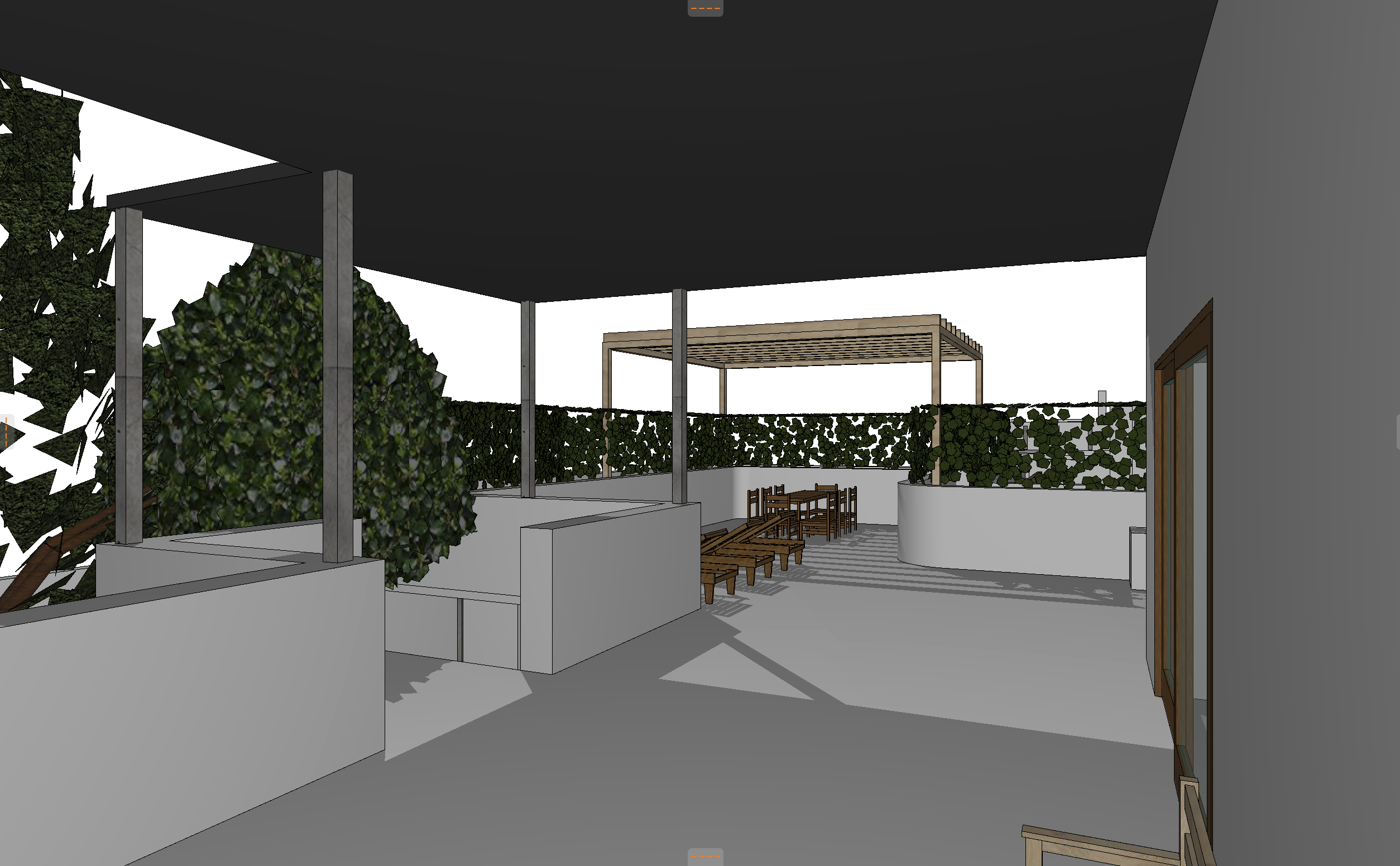 exterior shot render a serene and modern open patio with a relaxing atmosphere use muted gray tones for the flooring and walls complemented by rich green foliage climbing the walls feature a wooden pergola with light oak slats casting gentle shadows a row of warm toned wooden furniture adds a cozy touch soft ambient sunlight filters through creating a tranquil inviting space for leisure and reflection
