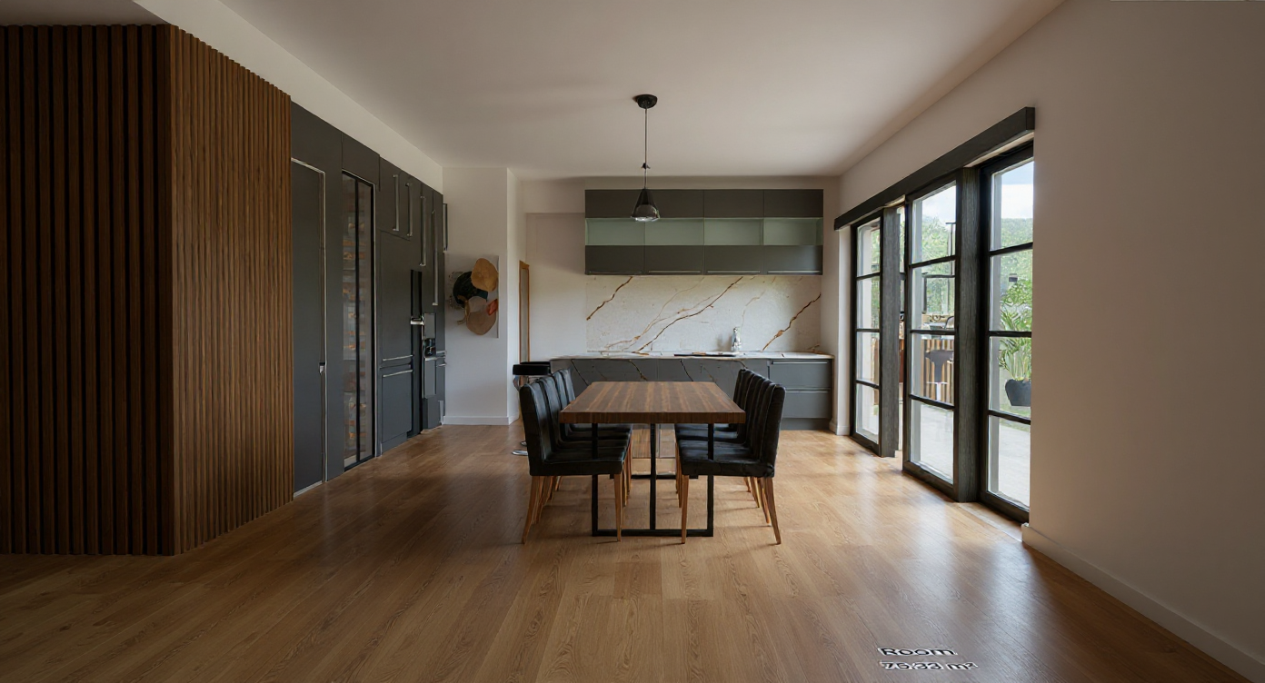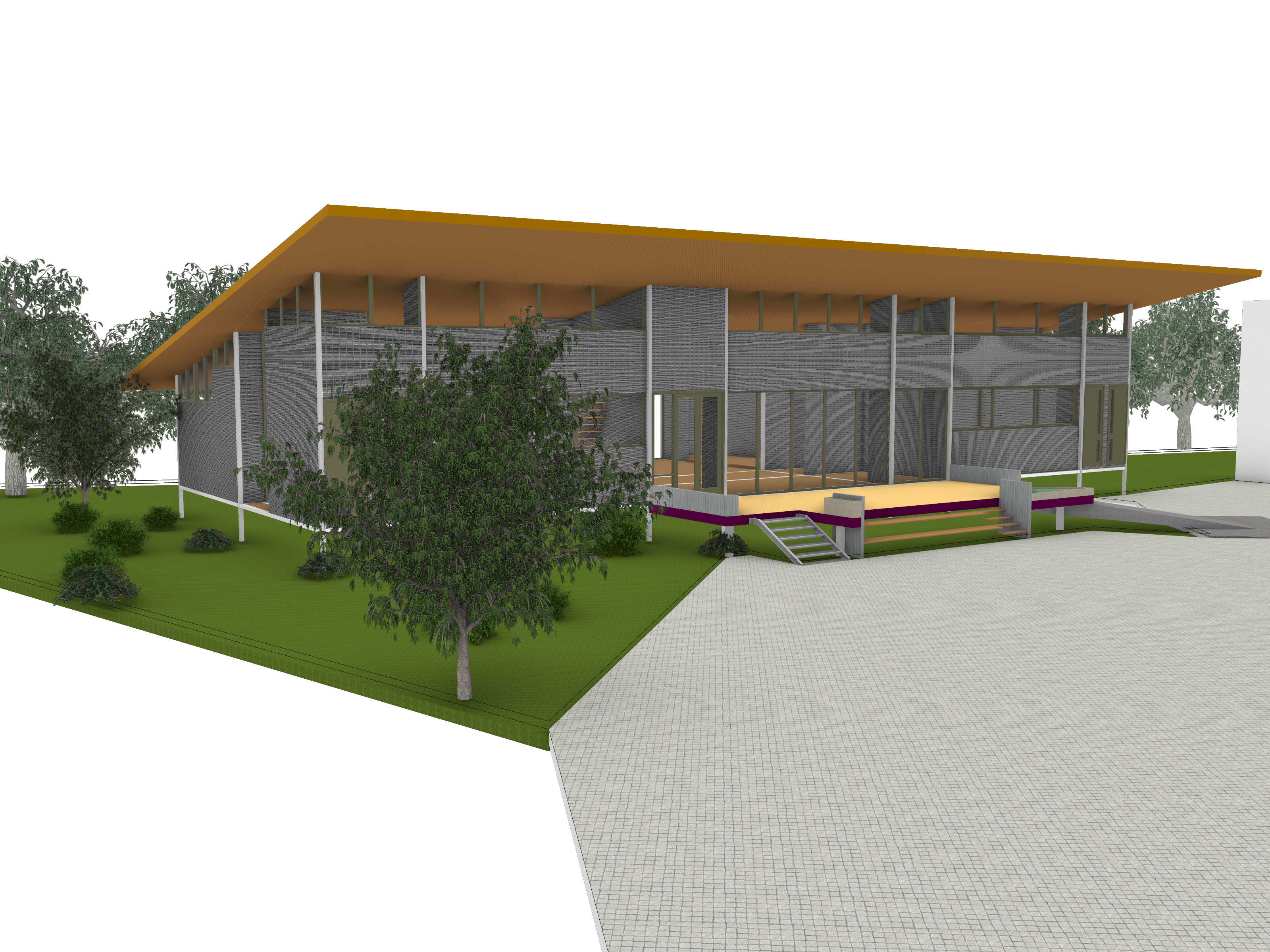 a modern architectural building with an expansive overhanging orange roof the facade is constructed of sleek grey concrete and glass elements reflecting a contemporary design set in a lush green lawn adorned with vibrant leafy trees enhancing the natural surroundings the steps and path are elegantly finished in soft gray stone the atmosphere is warm and inviting showcasing a seamless blend of nature and modernity under a clear blue sky include vibrant green for the grass rich brown for the wooden elements and soft white accents to create contrast