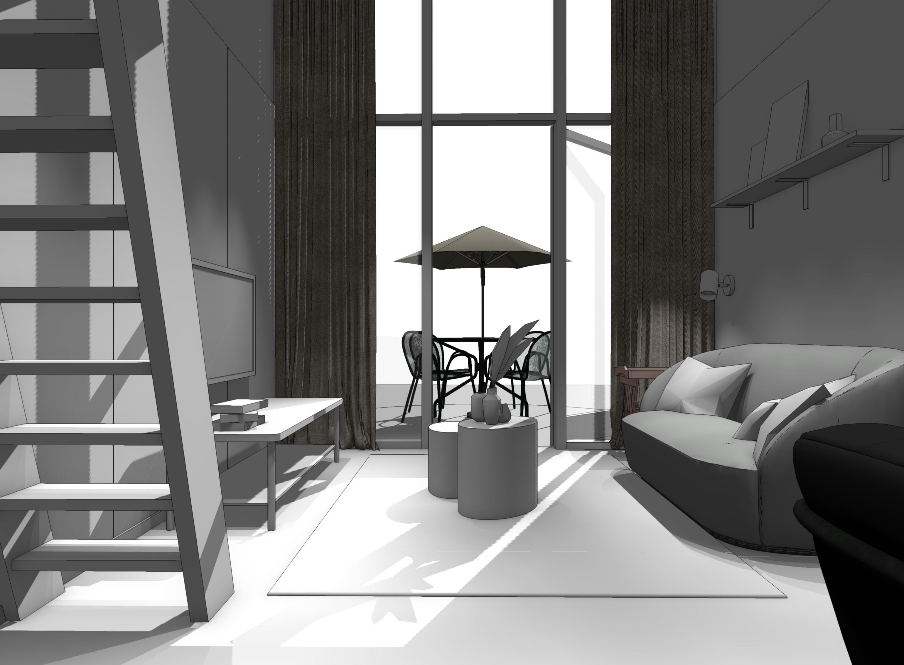 interior shot enhance this interior rendering with better lighting and more realistic materials using the same colors and materials as the moodboard do not add any extra furniture or details make the floor concrete and the stair in a green color
