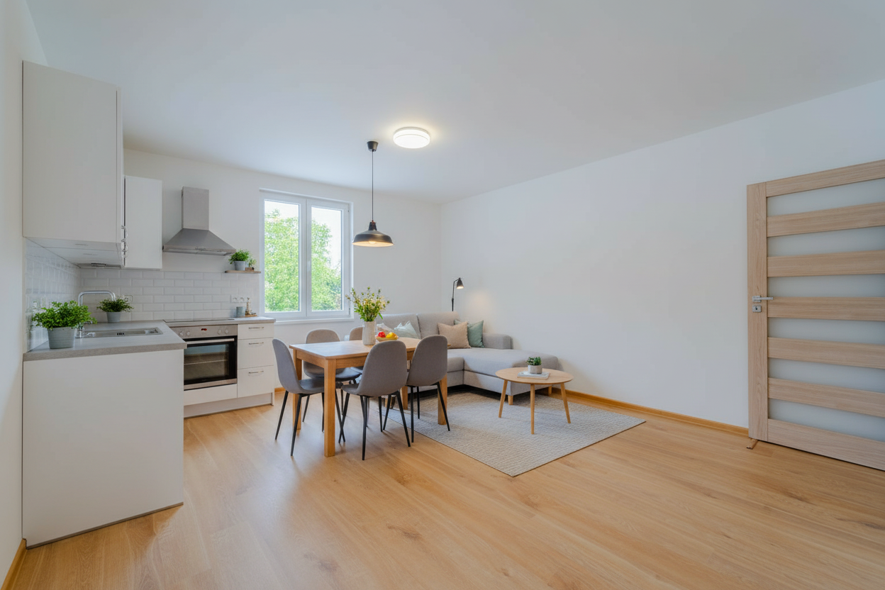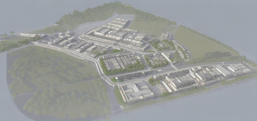 ultra realistic rendering of a modern industrial building white metal composite panel fa ade with subtle panel joints and crisp edges large reflective blue tinted glass curtain wall at the main entrance showing realistic reflections of the sky and landscape sharp geometric volumes forming a cantilevered upper block long side elevation with continuous white cladding and a diagonal cut window strip highly accurate perspective proportions and geometry as in the reference image exterior with smooth asphalt pavement on the left and a carefully maintained white gravel garden on the right including low shrubs and a sculptural olive tree bright daytime sky with soft cloud textures realistic shadows and natural lighting photorealistic textures high detail clean and sharp finish