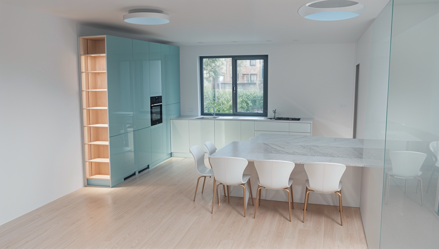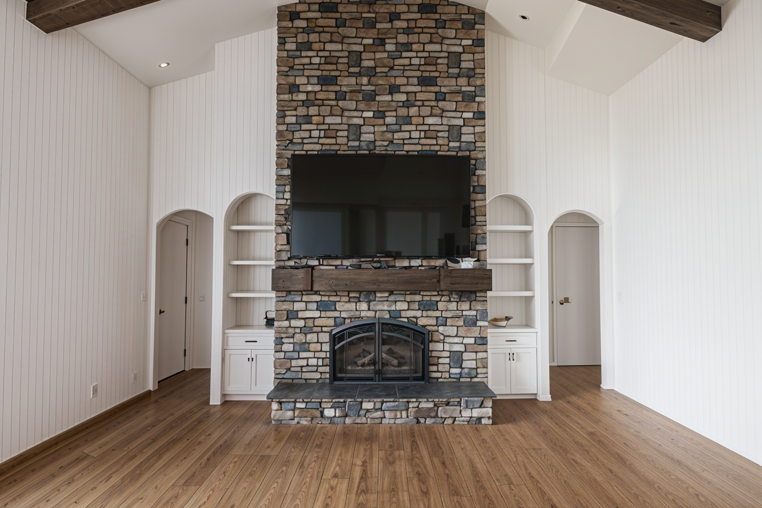white and black carrea tiles on the walls concrete tiles on the floor bright bathroom mirror behind the black sink