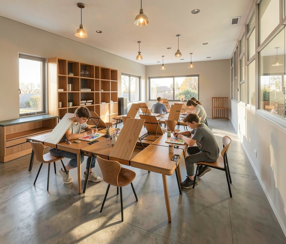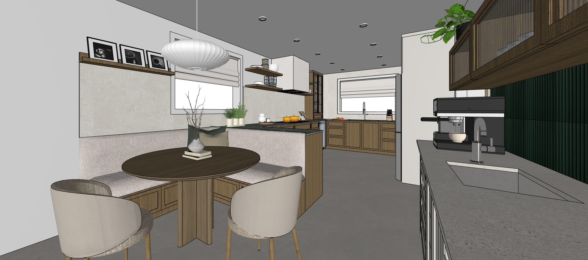 render this kitchen with realistic materials do not change the design materials and dimension just add realism and light effect show ampul natural light through windows add cabinet light in the sit on counter glass cabinets add undershelf lights for the floating shelves