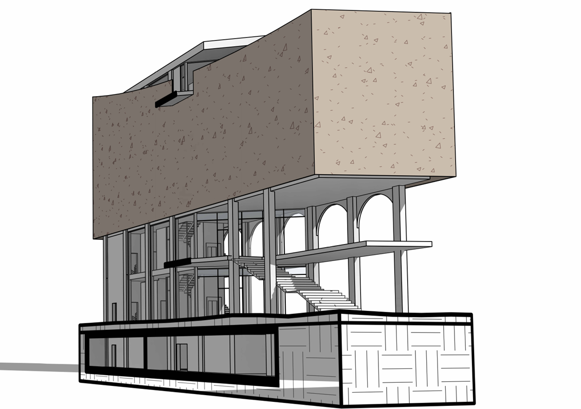 the facade of the buidlings should be old clasical stone type for the bottom porcion and a grid of bricole plates for sunshading with diferent designs and holes on the top shpuld blend in a classical landscape of prague old town the building is a museum of decorative arts do a clasical look with modern look on the top part the roof is a greeen roof and terrace architecture