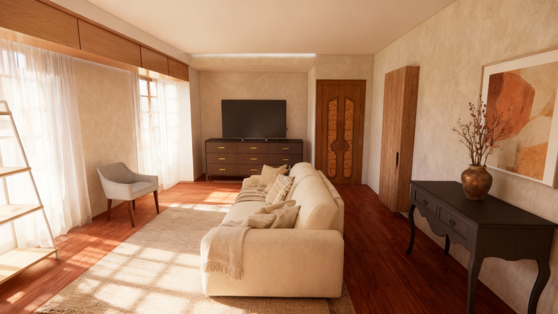 a cozy and elegant living room scene with a modern design featuring rich wooden textures the walls are a soft warm white providing a serene backdrop highlight the bed with crisp white linens and subtle grey accents exuding comfort and sophistication the wooden flooring and cabinetry are a deep warm oak enhancing the room s inviting atmosphere add natural light streaming through the window with soft gray curtains use subtle lighting for a calm relaxing ambiance and include decorative pillows with pops of red and black for a touch of vibrant contrast
