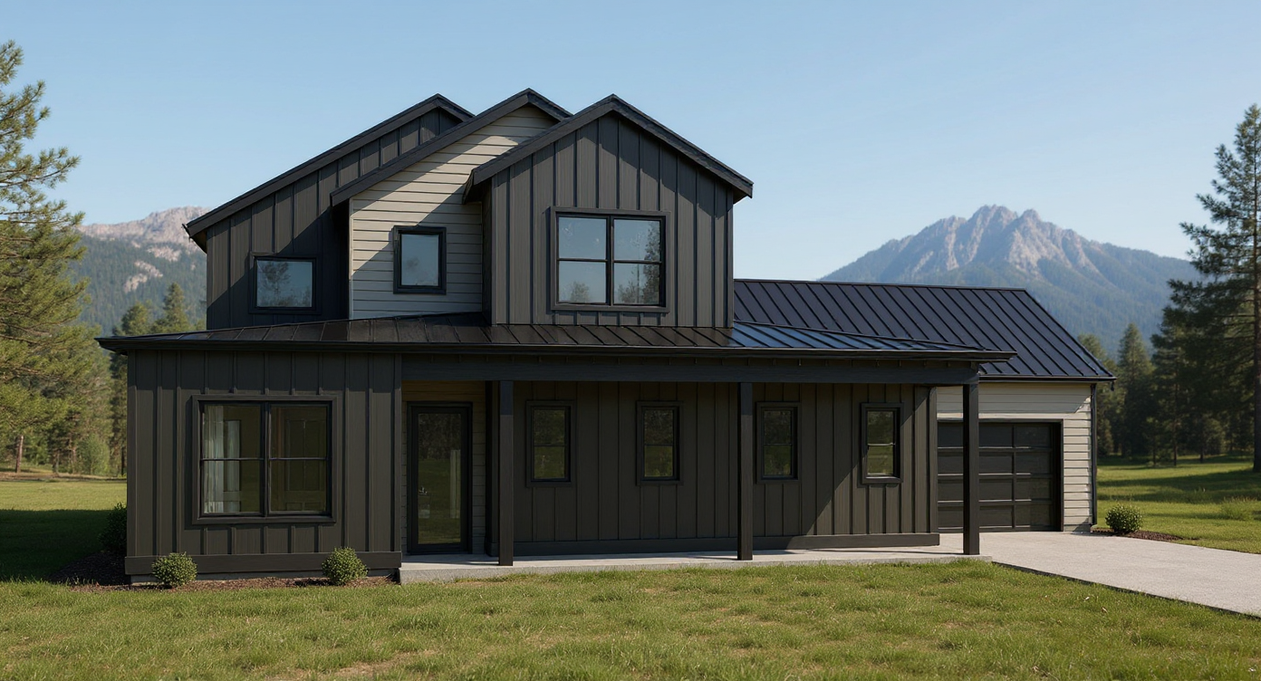 render a beautiful modern house with a charcoal gray exterior and contrasting light gray accents the roof is sleek matte black enhancing the contemporary style windows are black adding depth and definition surround the house with a lush green landscape and a clear blue sky capturing a serene and welcoming atmosphere during a sunny day low mountains and in distant background of suburban lot with a polished lawn add shrubs around perimeter driveway is asphalt