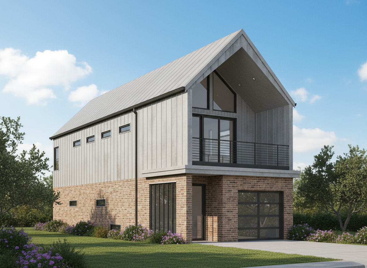 horizontal lap board and batten vertical 1x6 cedar and mega rib panels standing seam roof in texas color palette