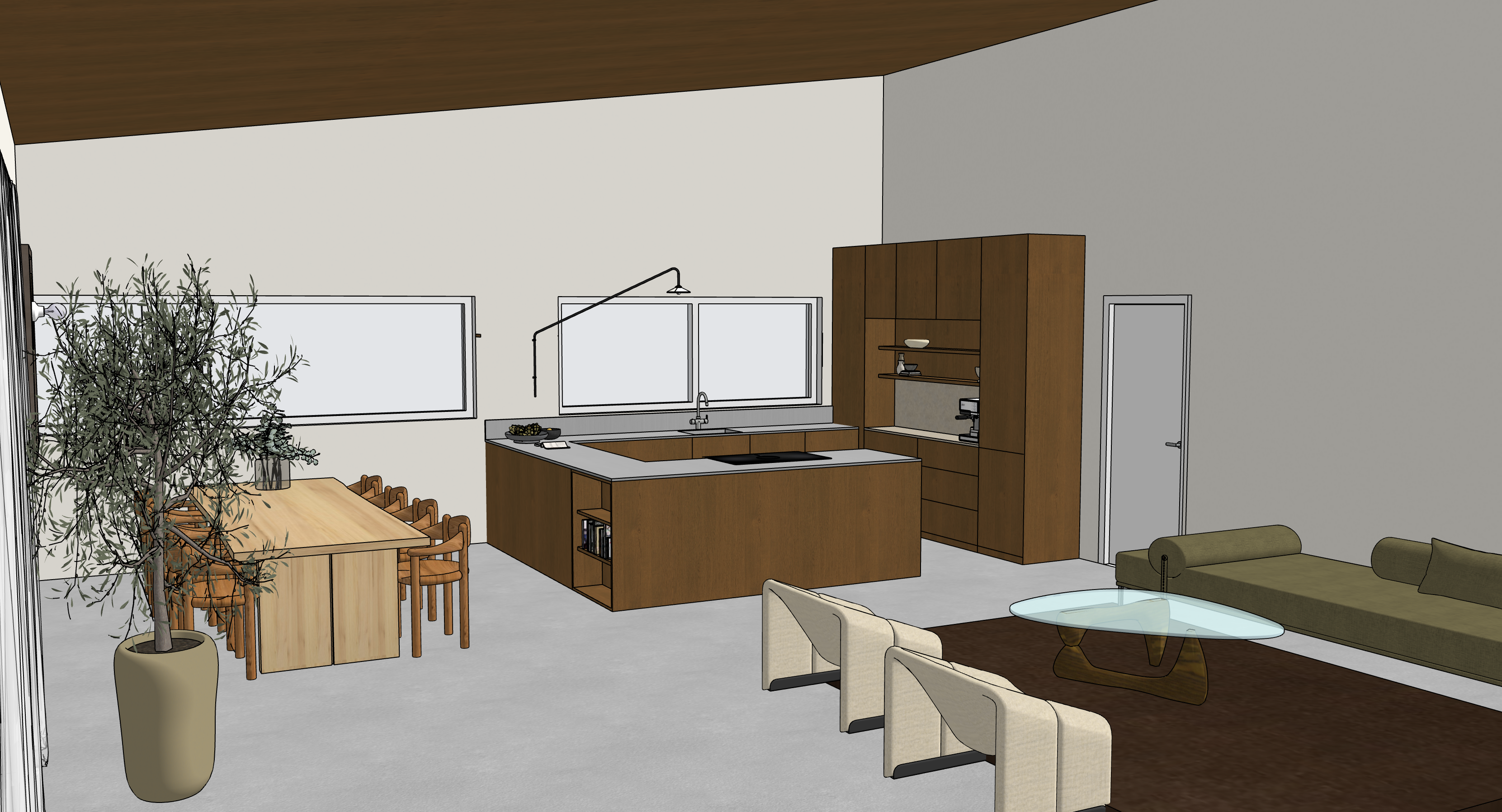 the floor is grey concrete the rug is brown wool the worktop of the kitchen is stainless steel