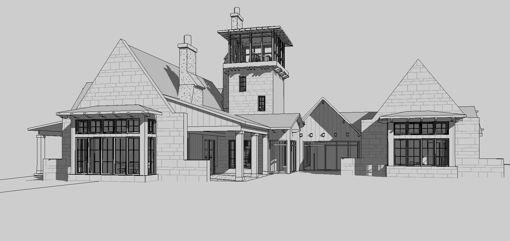 modern farmhouse rustic stone gables vertical wood siding stone tower large glass windows tall grass foreground