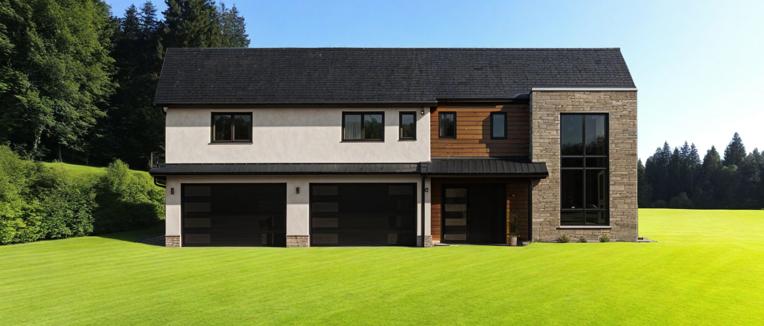 black roof black windows white smooth stucco walls light color stacked stone black garage doors with three vertical windows wood plank wall pewter paver driveway architecture