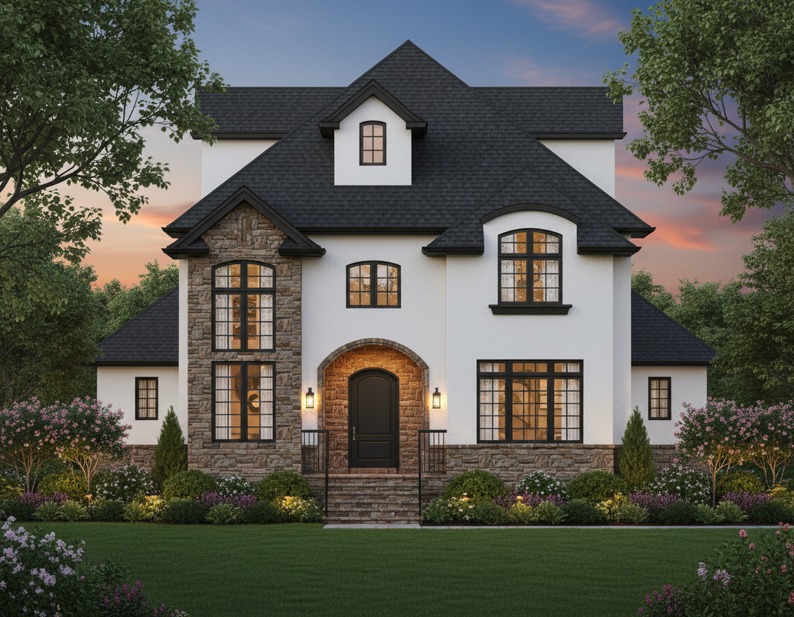 realistic architectural miminalist garden prairie style planting concrete walls green hedging in background steel posts in front of hedge rustic corten steel sheets stone boulders granite sett paving shadows with sunlight coming from top left