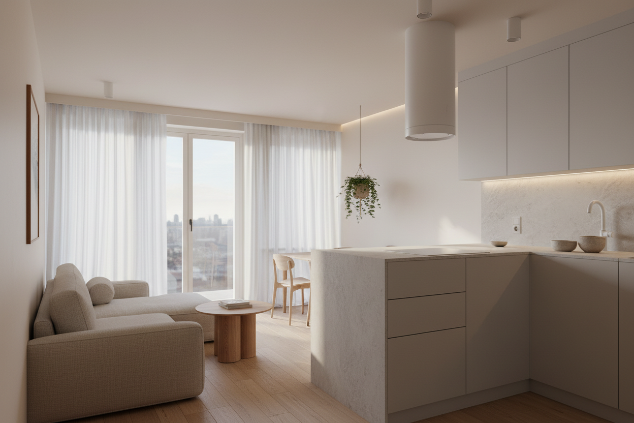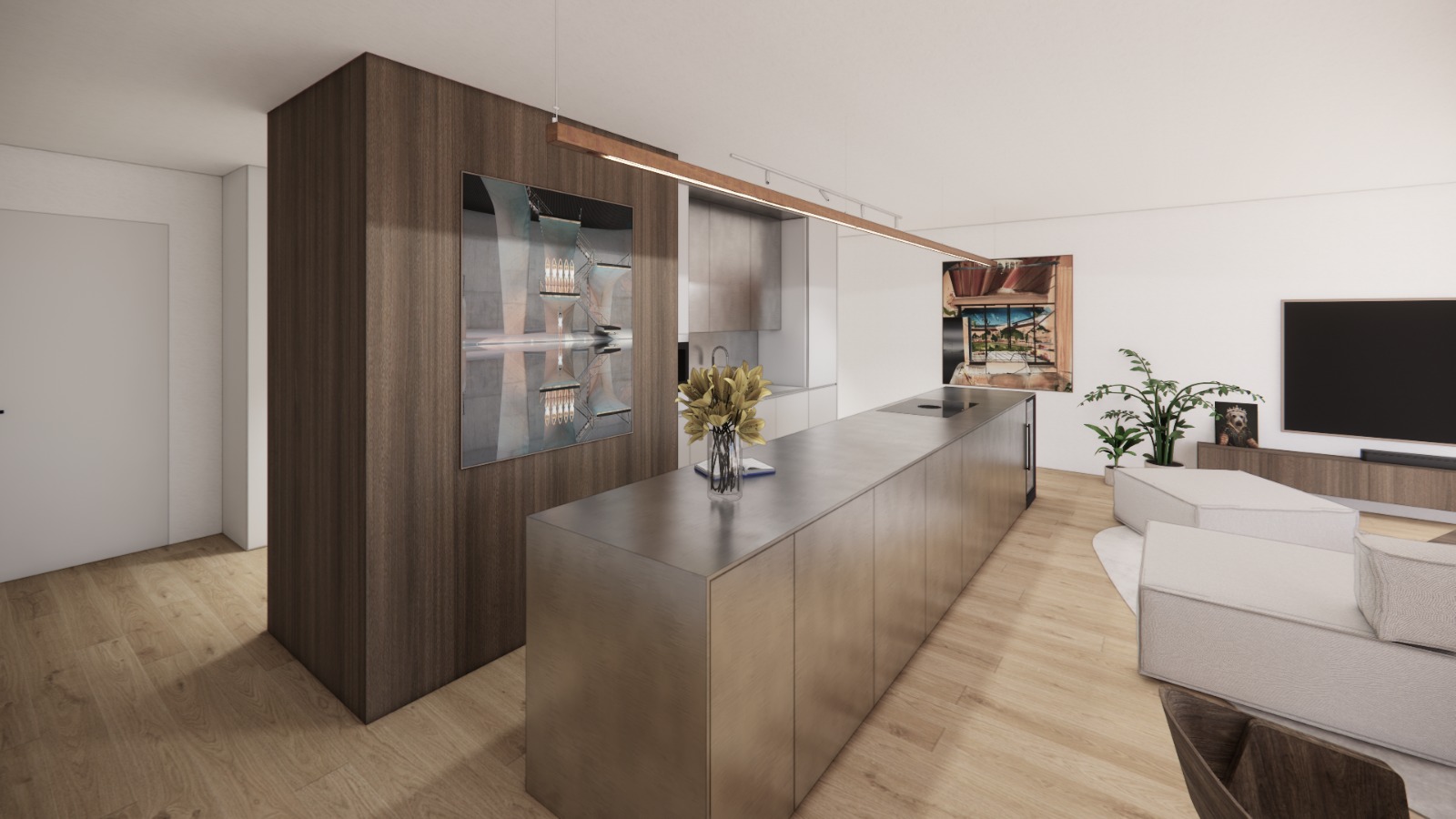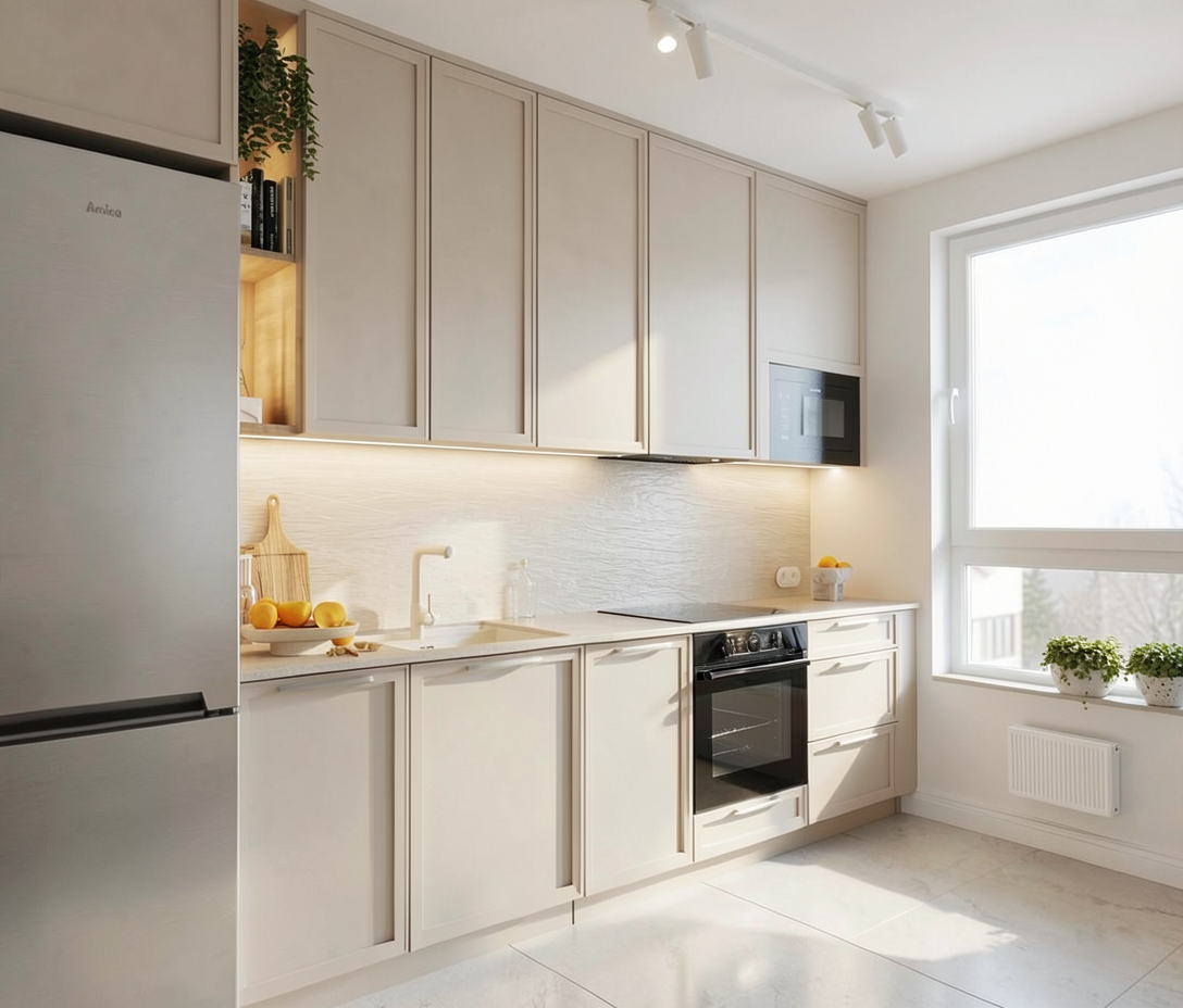 preserve materials make it real like kitchen island make from aluminium material sofa from canvas fabric used for sofa in the same color make it more cozy use light beige structured plaster on walls and ceiling