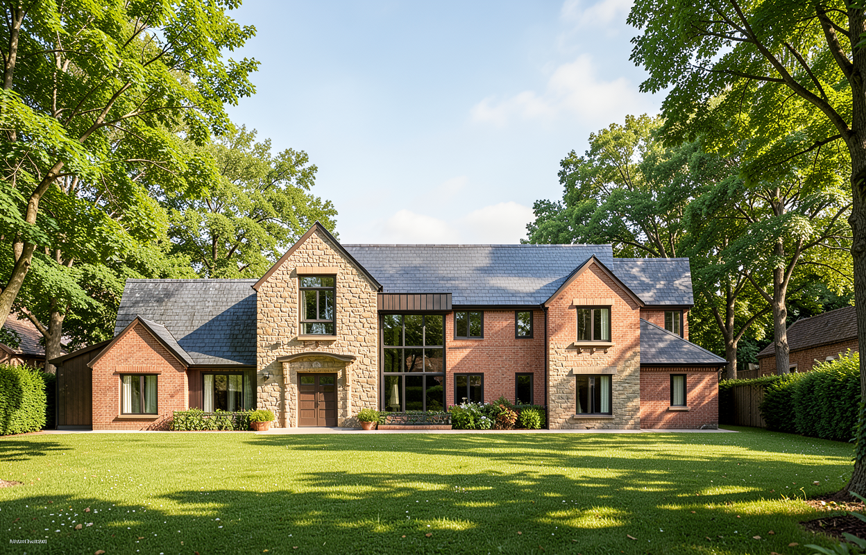 ultra realistic architectural visualization based strictly on the provided reference model maintain all original geometry proportions layout roof forms building positions driveway shape grading and architectural features exactly as shown do not redesign reinterpret or modify the structure the design is a modern barndominium style home on a sloped hillside the main house is a two story structure with deep red siding and black trim featuring a long covered front porch supported by natural wood posts the porch spans across the front fa ade with concrete steps and a raised platform large rectangular windows with bronze colored frames are evenly spaced on both floors the main entry door is centered with sidelights featuring a bronze finish a lower garage volume is attached to the right side of the main house to the left include a separate detached garage with matching red siding and metal roofing the buildings are connected by a wide light gray concrete driveway with the same shape and slope as the reference include the curved asphalt road edge with curb in the foreground both buildings have standing seam metal roofs in a muted earthy tone preserve the exact roof slopes and forms environment place the property within a lush dense forest setting with tall mature trees mix of pine and deciduous rich green foliage and natural undergrowth surround the property with trees while keeping all building elements clearly visible maintain the original terrain shape and grading enhancing it with realistic grass and landscape detail only lighting soft natural daylight slightly overcast sky subtle sunlight filtering through trees creating soft realistic shadows materials highly detailed and photorealistic textures wood grain posts red siding metal roofing concrete driveway asphalt road grass tree bark leaves and metallic bronze window and door finishes with subtle reflections style photorealistic cinematic composition eye level perspective wide angle lens 24 28mm quality ultra high resolution 8k global illumination ray traced lighting and reflections physically accurate materials sharp focus high dynamic range