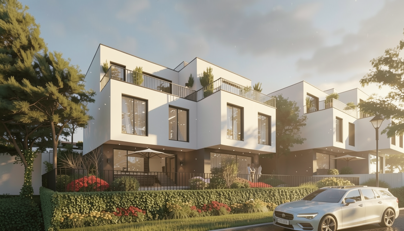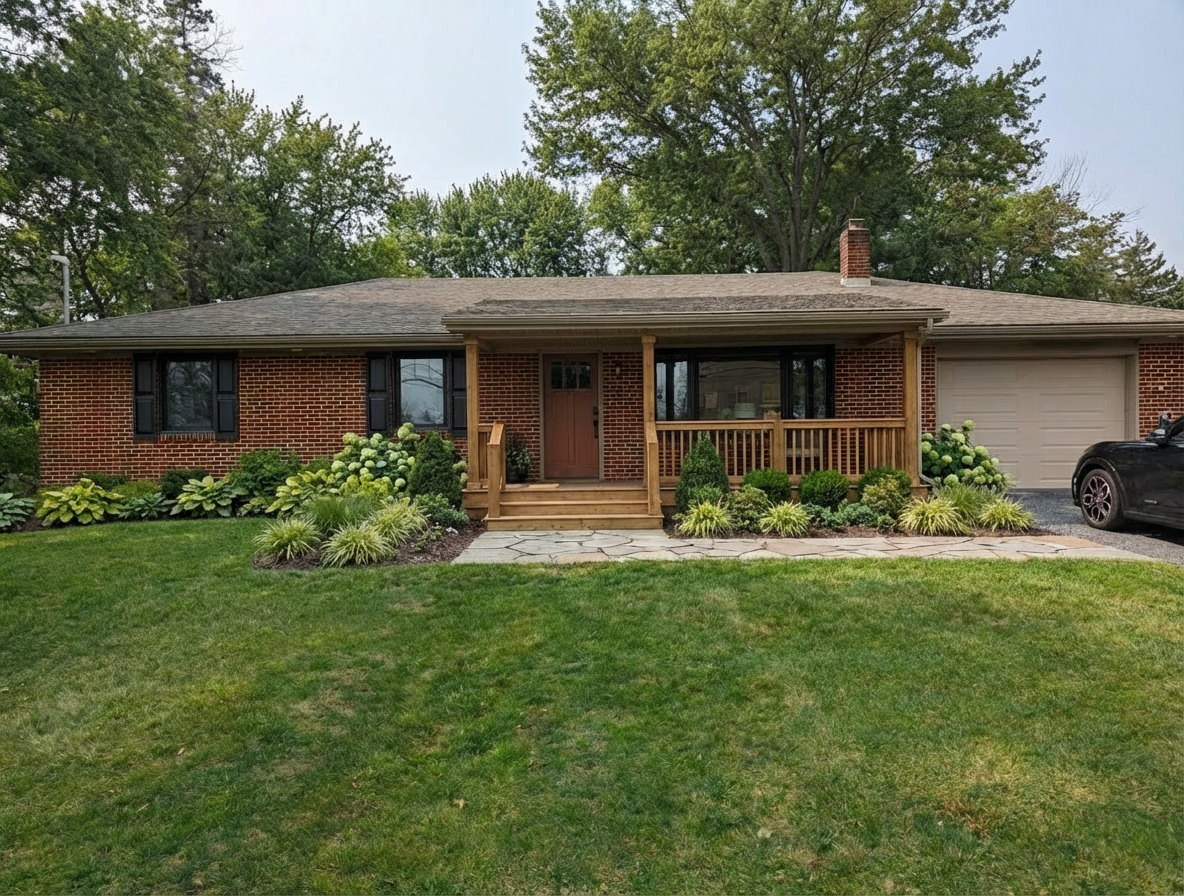 absolute rule keep all house geometry windows doors roof and garage exactly as in the photo only modify the front step sidewalk and landscaping by making it a front porch made of pavers make the styling mid century modern