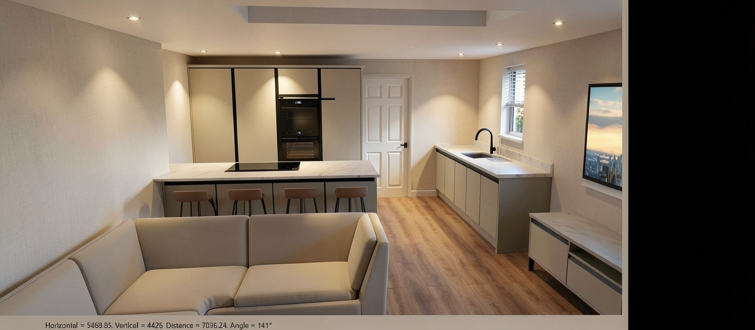 add bar light over peninsular and a man cooking at the induction downdraft hob on the peninsular