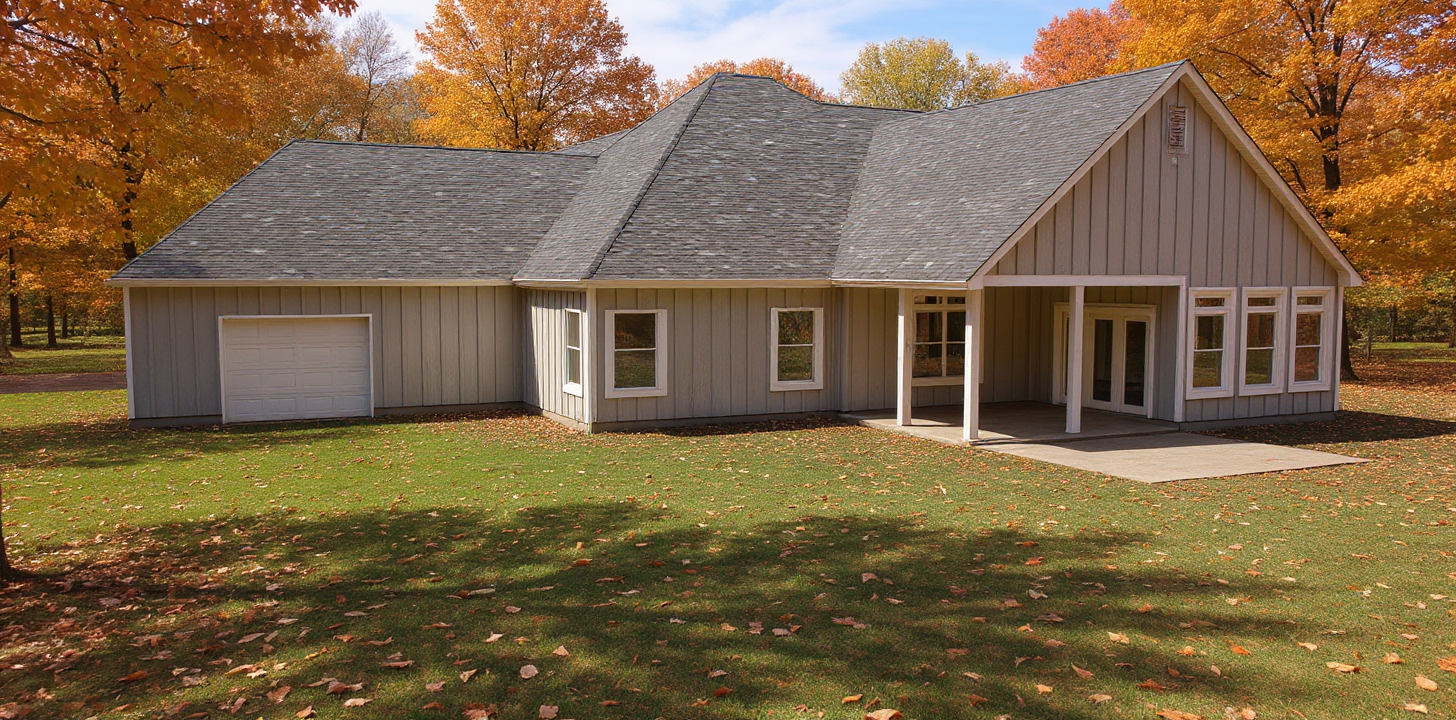 add a lot of trees flowers and bushes in the back of the scene the roof of the house is covered in grass