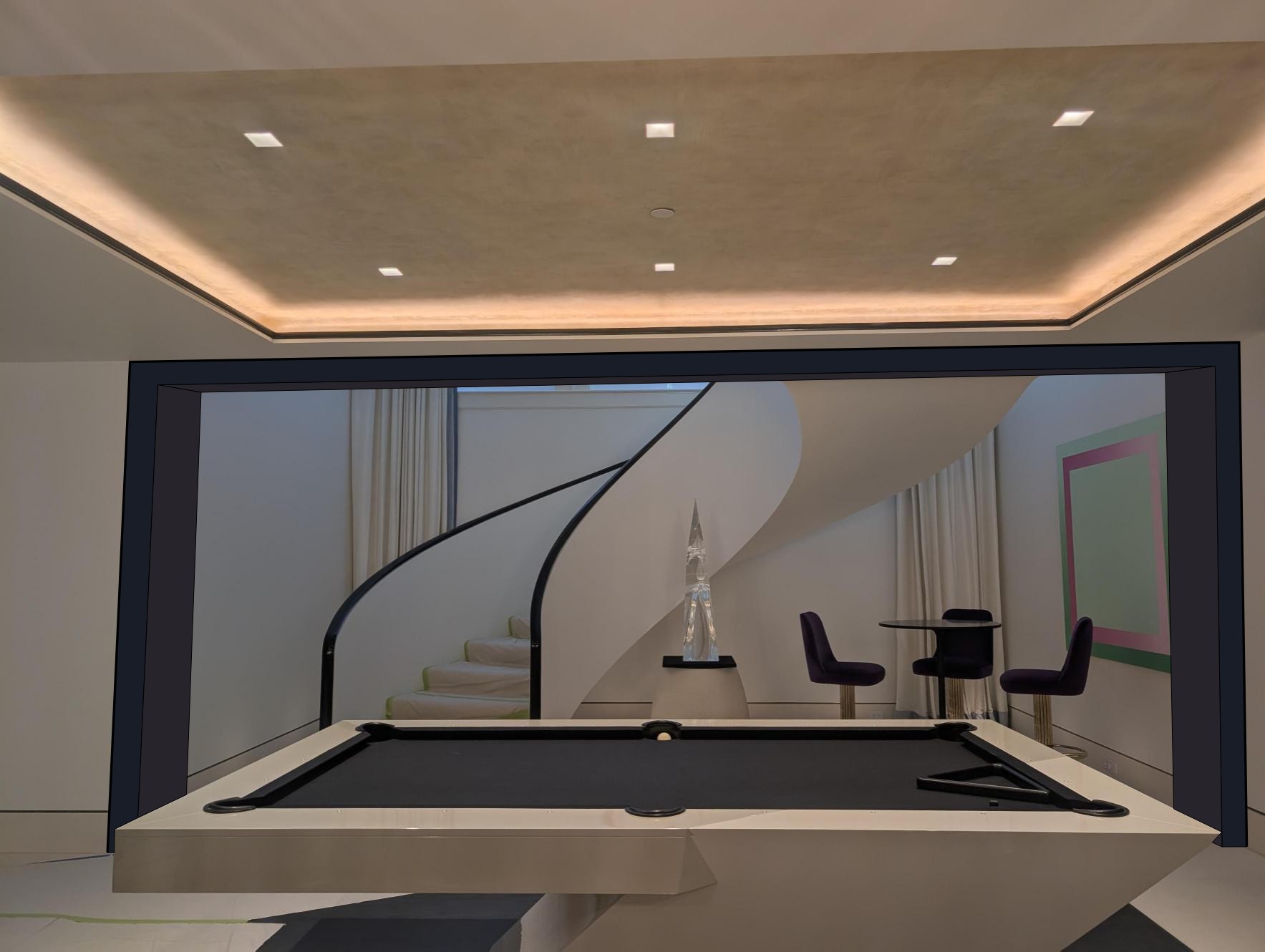 keep everything the same but change the lower ceiling to red venetian plaster keep the upper ceiling exactly as is