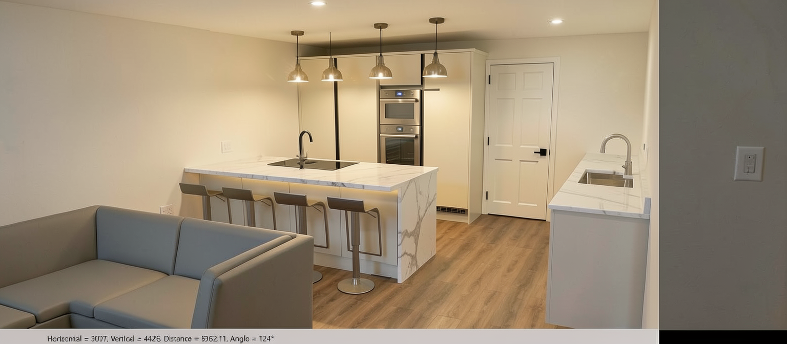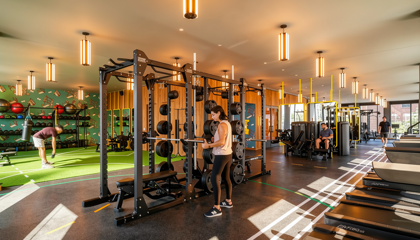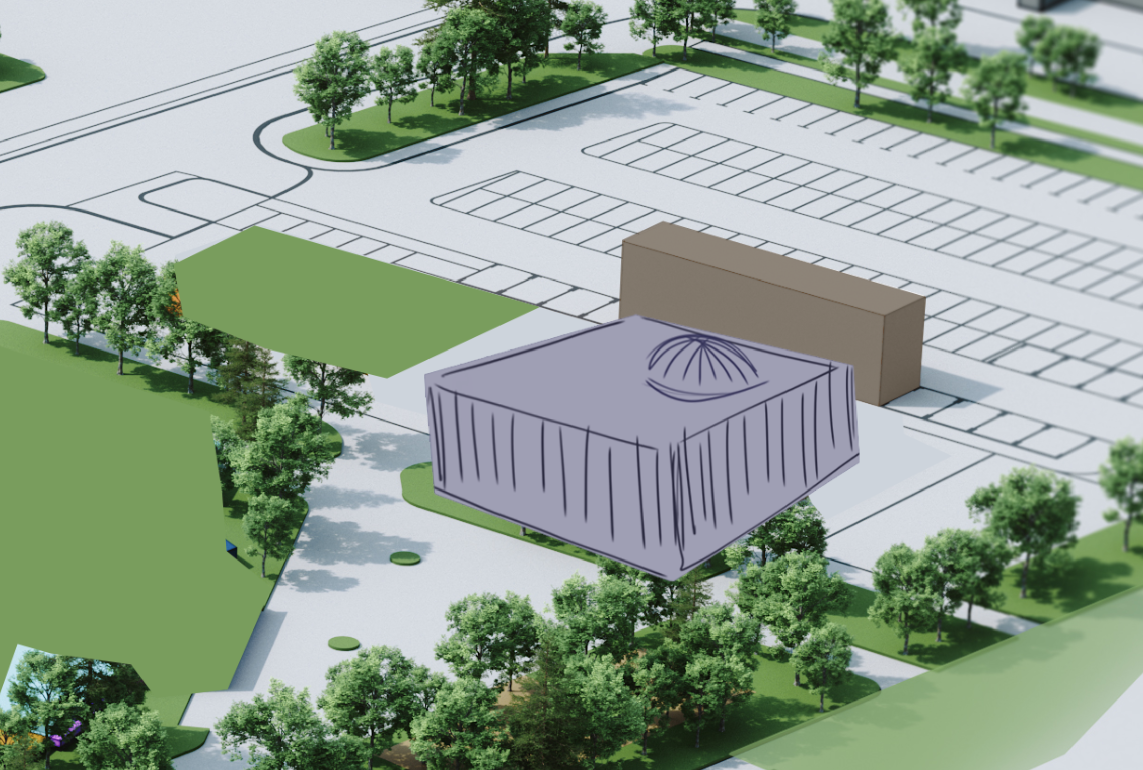 a serene architectural rendering capturing a spacious parking lot and lush surrounding park the parking lot is textured in light gray with subtle shading to accentuate depth marked by crisp white linework for parking divisions the central building designed with minimalist elegance accented by a gracefully curved dome the adjacent structure is a rich earthy brown wood adding grounded contrast surrounding vibrant green foliage of diverse trees adds warmth and life complemented by bright orange and autumnal colors amidst some leaves for seasonal touch the sky is a clear azure creating a tranquil sunny atmosphere that enhances the overall peaceful and inviting ambiance of the scene