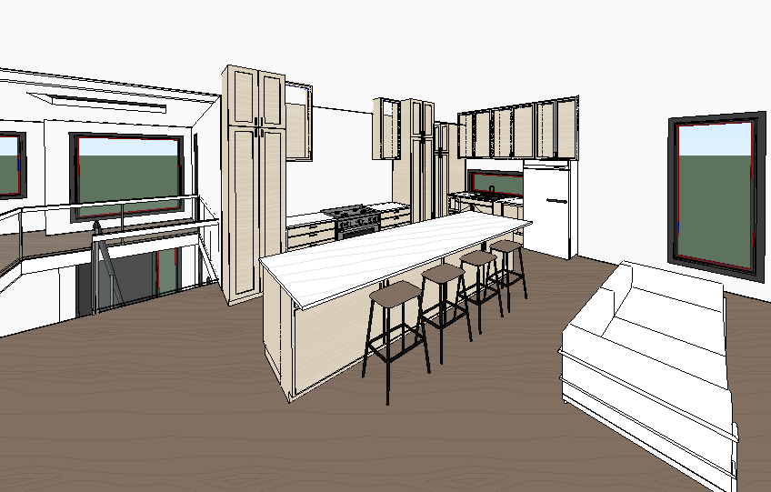 add natural lighting into this kitchen add a fan over the range add some nice potted plants around make the background out the windows nice