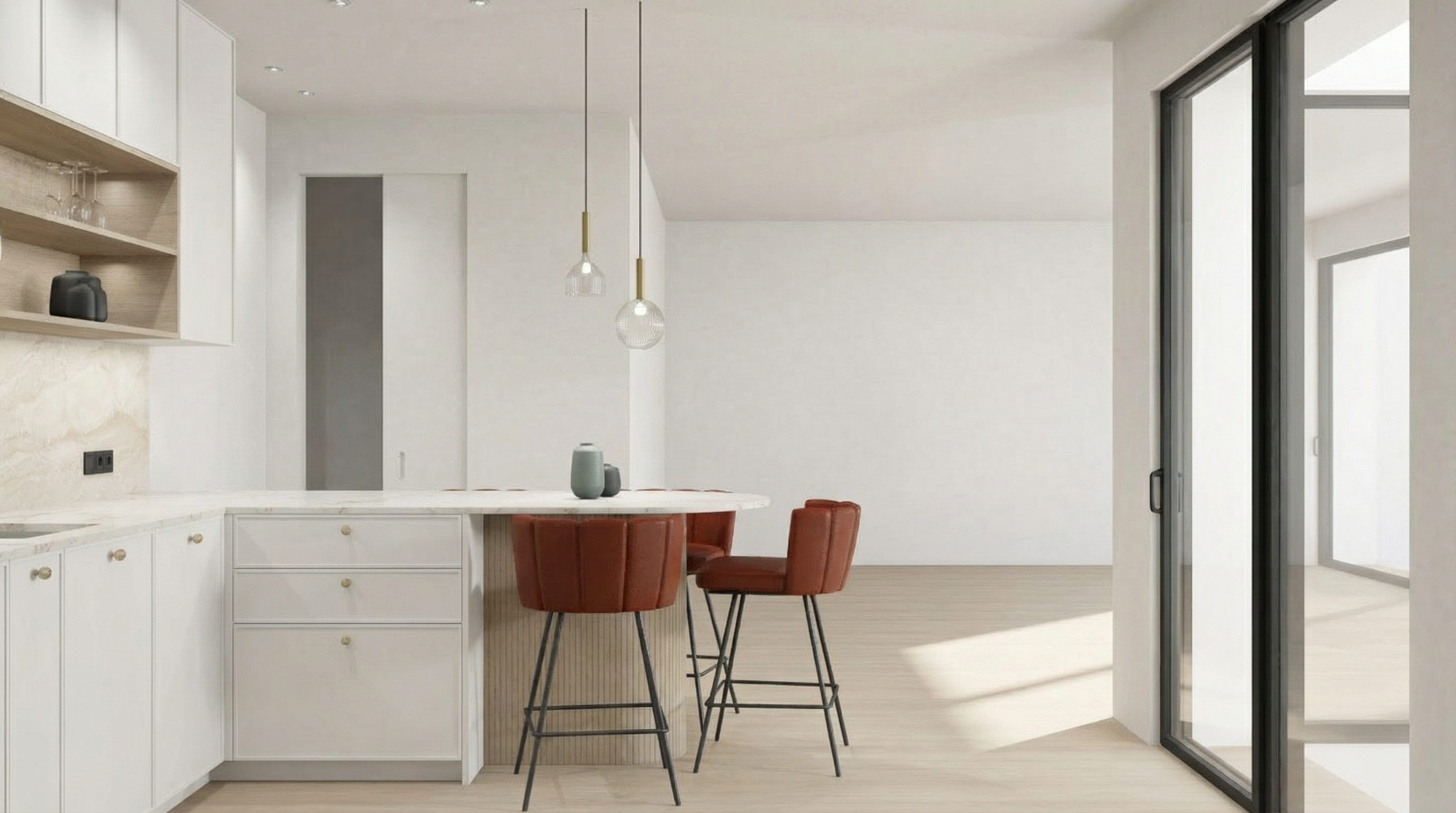 put a grey closed cabinet on the right side of the picture to cover the right window and add led light stripe hidden on the ceiling on the left of the picture