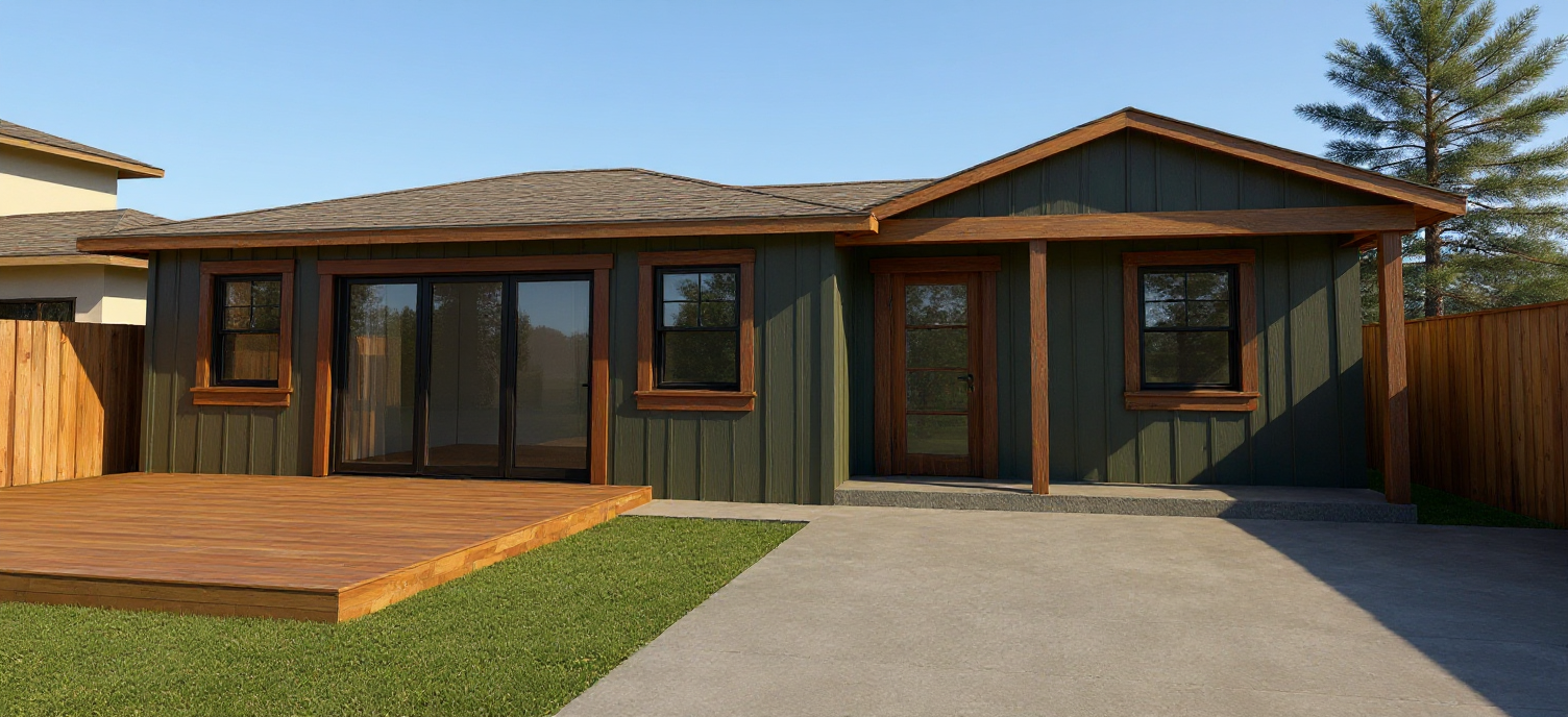 scandinavian style bungalow with cedar wood window and door trims on a sunset california weather and native california landscape with wall sconce lights at doors lights coming out of windows and doors