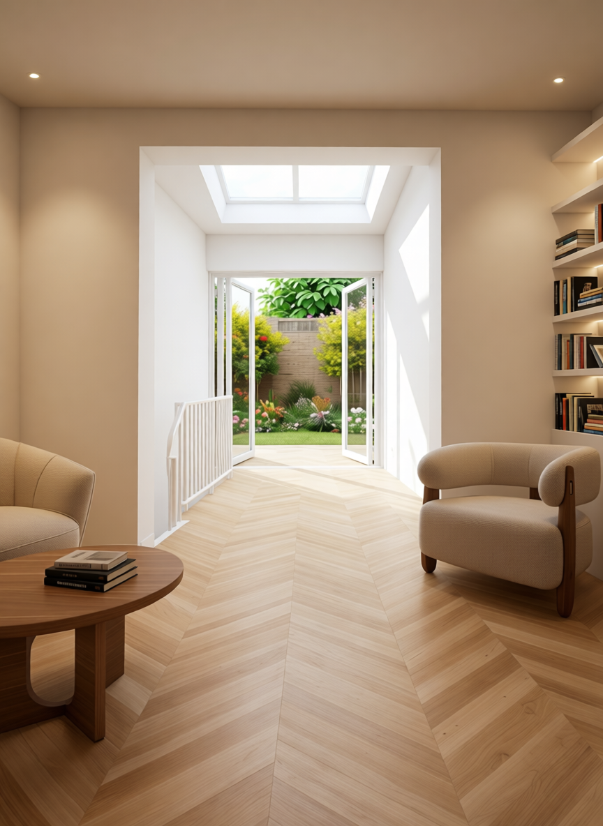 interior room with soft ambient lighting featuring a light oak chevron patterned wooden floor a comfortable warm white armchair and a round wooden coffee table the walls are painted in a warm off white with gentle recessed lighting illuminating built in shelves in light oak a large skylight above casts natural light enhancing the tranquil atmosphere bi fold doors open to a lush garden with vibrant green leaves and flowers there are books on the shelves and on the coffee table the balustrade and the doors are white the balustrade has a light oak handrail the overall mood is peaceful and serene with a blend of natural and soft neutral tones