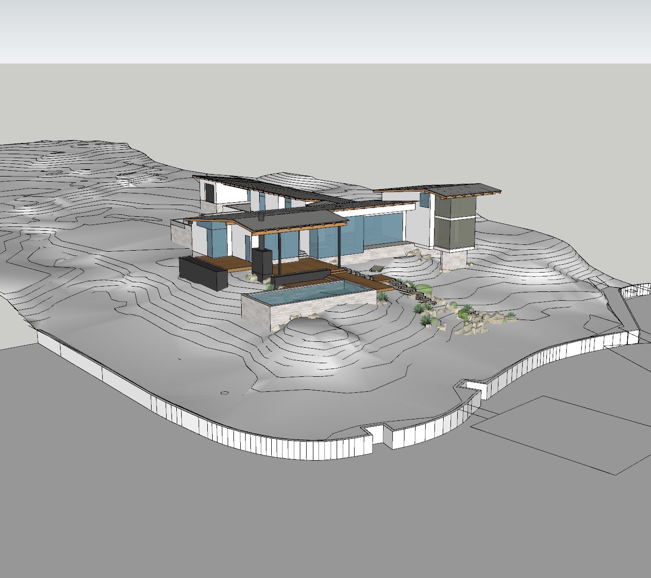 aerial architectural rendering of a contemporary lakehouse residence on inks in the texas hill country late summer afternoon light south facing drone view over the lake looking back at the house calm blue green water at normal level with gentle wind ripples shoreline has a concrete bulkhead with native grasses above rolling texas terrain with scattered live oaks and ashe juniper dry golden grasses with some green pockets prickly pear accents warm atmospheric haze over distant low hills the lakehouse sits lightly on the site with a refined modern material palette white stucco siding light gray standing seam metal roofing exposed timber rafter tails retain the exact structure window arrangement rooflines foundation height and proportions exactly as shown in the reference image minimal site disturbance native drought tolerant landscaping natural pathways photoreal architectural visualization ultra realistic lighting crisp shadows crisp building edges high detail vegetation and ground textures glass reflections and a vibrant clear sky with light atmospheric depth render in hyper realistic architectural visualization quality 8k resolution