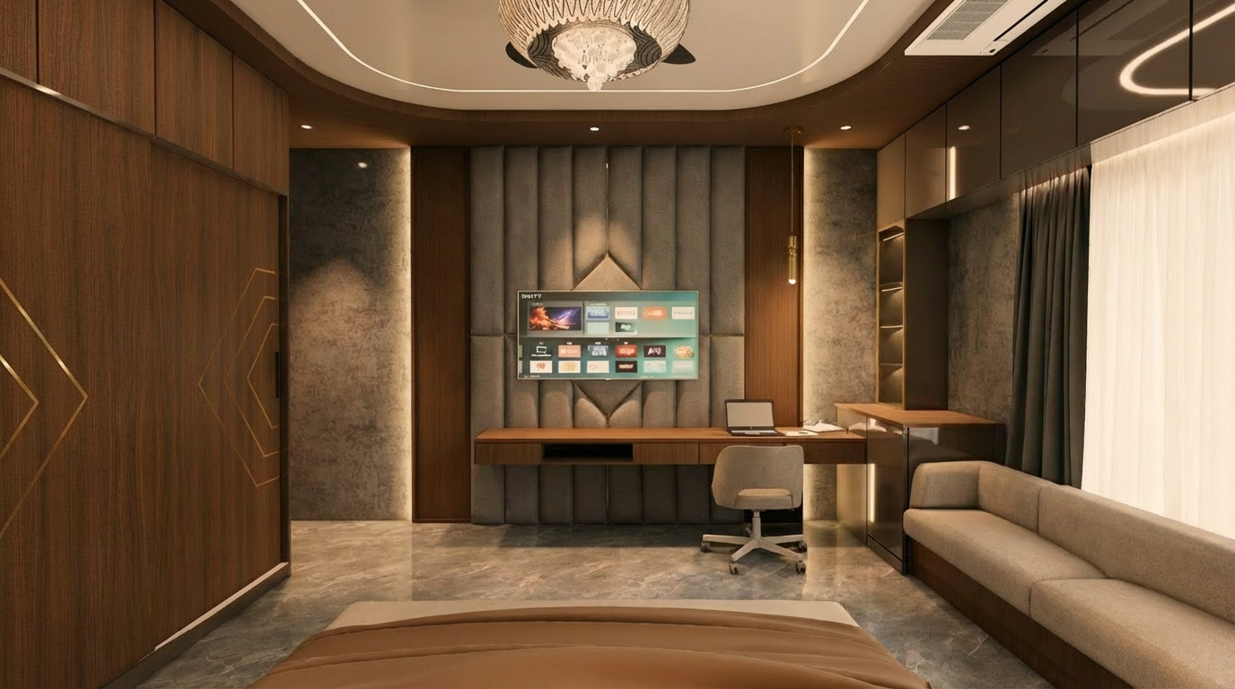 n this hall replace the back wall with a floor to ceiling wall to wall black aluminum framed glass wall divided into four equal sections replace the existing visible windows with black aluminum windows featuring muntin divisions apply clay plaster to all walls and the ceiling finish the floor in bologna microcement by solo gietvloeren keep the layout proportions and all other elements unchanged