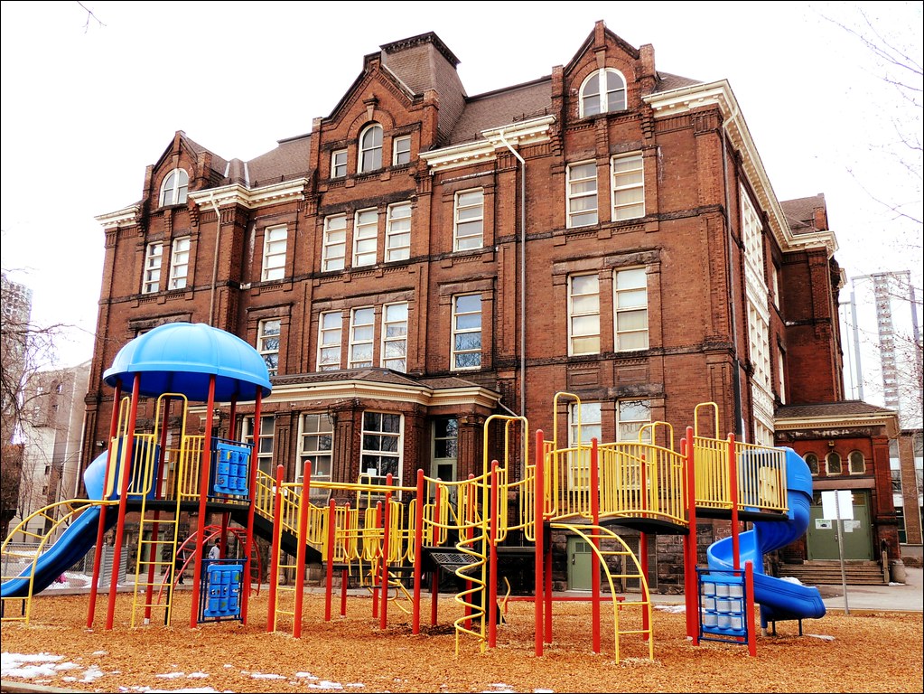 modernist exterior shot create a colorful glass walkway going from the top of the old heritage building in the background leading down to the playground in a futuristic indoor outdoor playground architecture