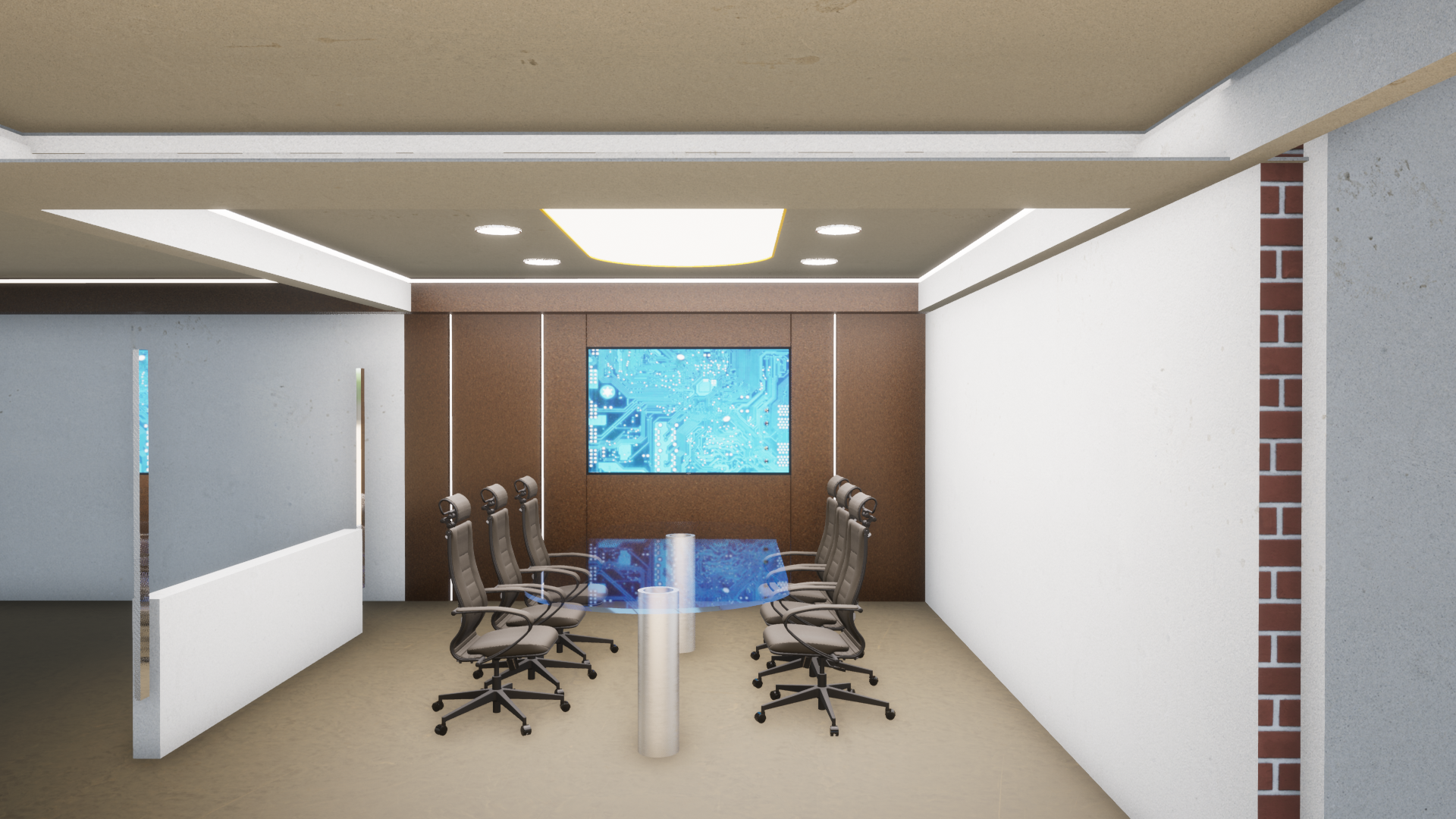 modern conference room elegant and sophisticated a sleek glass table with a translucent blue hue is surrounded by high back ergonomic chairs in dark brown leather the walls feature concrete brown panel at the front on which a high definition digital screen the remaining walls are clean with a crisp gray finish a portion of a side wall has an exposed red brick pattern adding a touch of rustic charm the ceiling in a soft gray houses recessed lighting and a central white luminous panel casting an ambient glow the atmosphere is professional and cutting edge perfect for strategic meetings or presentations