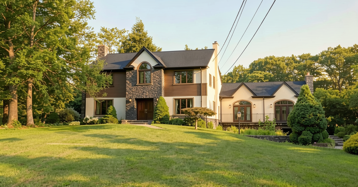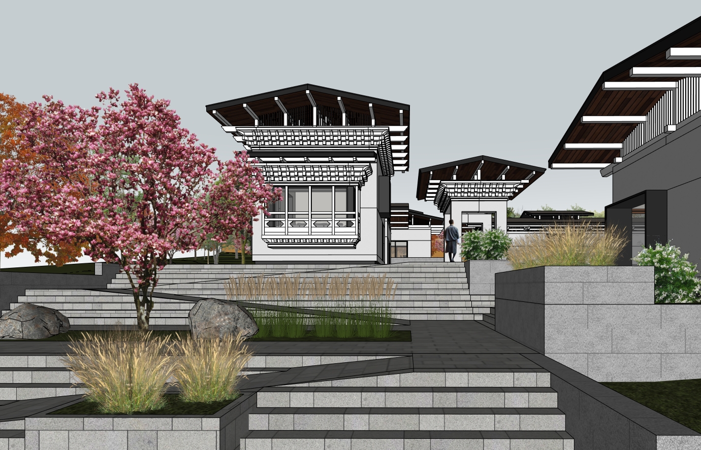 render this exterior sketchup model as a photorealistic landscape visualization matching the mood brightness and atmosphere of the cherry blossom reference photo apply the following sky lighting replace the flat grey sky with a soft clear pale blue spring sky bright airy and clean as seen in the reference lighting should be gentle diffused daylight soft shadows no harsh contrast overall scene brightness should be elevated and luminous light fresh and ethereal not dark or heavy cherry blossom trees replace all existing pink and flowering trees throughout the composition with full bloom japanese cherry blossom trees sakura the blossom colour should be a delicate soft pink to blush white exactly as in the reference photo densely layered cloud like canopies of fine petals trees should feel abundant and enveloping lining both sides of the central axis and flanking the architecture foreground ground replace the dark black pathway with a light warm grey stone or pale granite surface softly lit the lawn areas should be a fresh spring green bright and well lit scatter fallen cherry blossom petals lightly across the ground and steps to enhance the seasonal mood water feature if applicable if a reflective pool or water body can be introduced at the foreground add a still mirror like reflection of the cherry blossoms and sky referencing the tranquil pond reflection in the reference photo architecture retain all existing building forms rooflines terraces and staircase layout exactly as modeled render facade materials in light warm stone or off white plaster to complement the soft pink blossom palette dark roof elements may remain as contrast overall mood soft poetic japanese spring garden quiet luminous and romantic reference hirosaki castle cherry blossom park japan photographic quality wide landscape composition there is no water