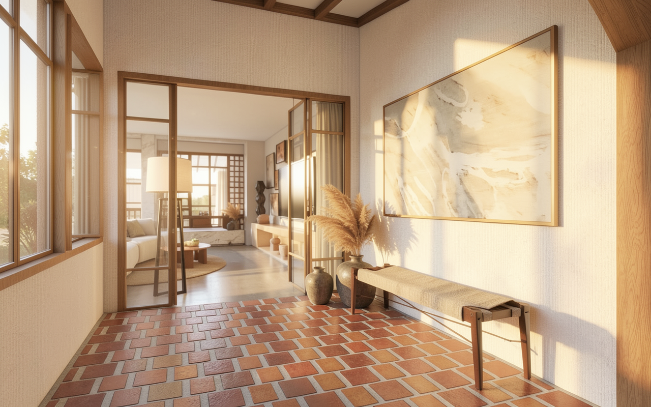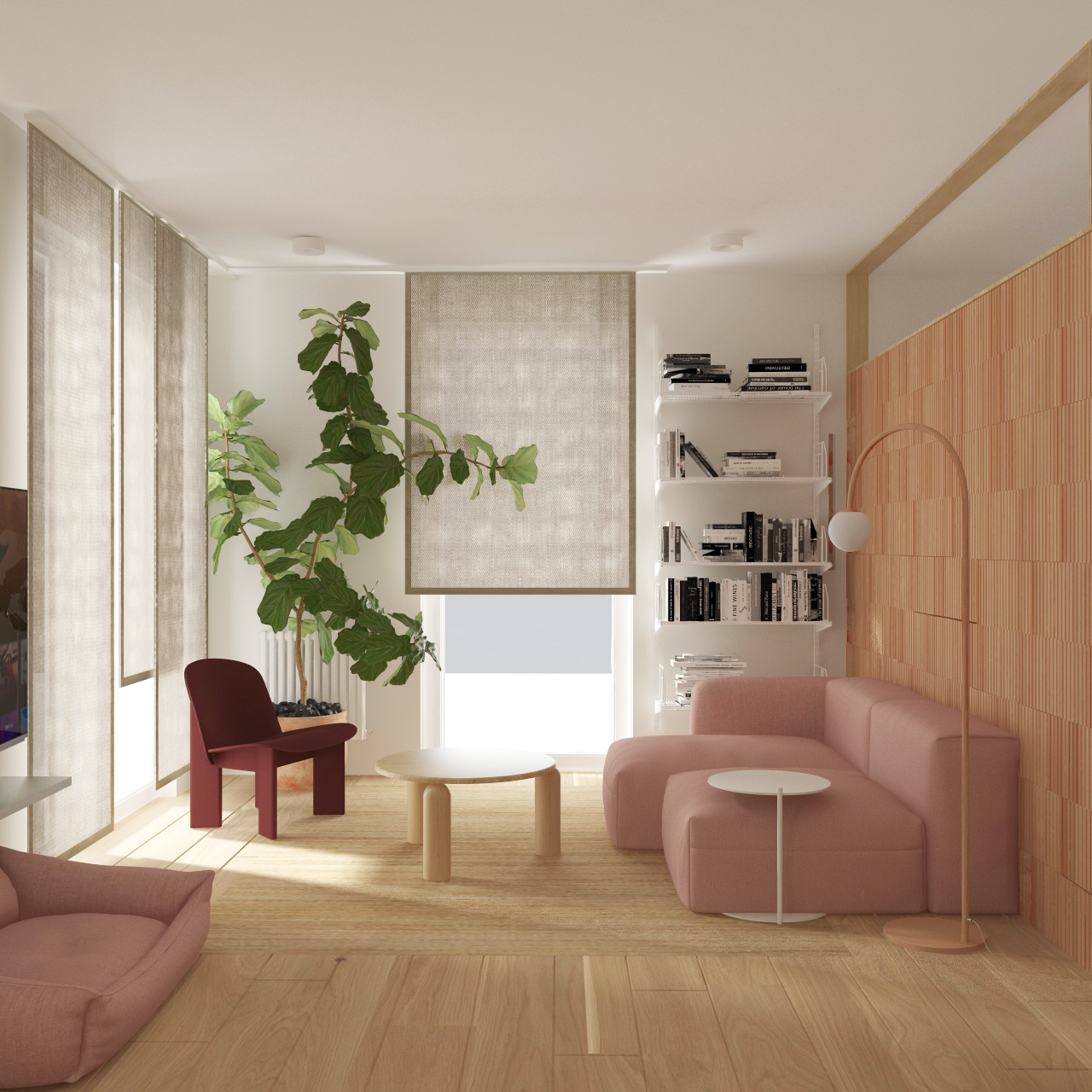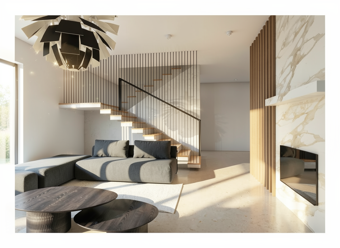 enhance the photorealism of this architectural visualization while preserving the design exactly as it is do not alter any materials colors textures finishes furniture layout proportions or architectural elements maintain all existing material tones and surface characteristics precisely as shown improve realism strictly through lighting and rendering refinement physically accurate artificial lighting simulationnatural daylight entering from the background with correct light temperature separationrealistic global illumination and secondary light bouncehigh dynamic range lighting hdr with balanced exposuresoft natural contact shadowsaccurate ambient occlusion in corners and object intersectionssubtle physically correct reflectionsrefined material roughness without changing material type or color micro contrast enhancement for surface depthextremely subtle surface imperfections fine micro variation only no texture change very delicate natural depth of fieldcinematic but neutral color grading no color shift no stylization ensure correct light interaction between artificial interior lighting and daylight from the background preserve the original atmosphere and composition no redesign no restyling no object modification final result should resemble a high end professional architectural photograph ultra realistic natural optically accurate well balanced and physically plausible the colour of the wood should stay warm and oak scene should be iluminated by daylight color and white balance protection preserve original white balance exactly as in the input imagedo not shift color temperature no cooling no warming do not modify tint no green or magenta shift preserve original color gradingno additional saturationno vibrance boostno contrast based color enhancementno stylizationno cinematic lutneutral color scienceaccurate color reproductionmaintain original rgb values and tonal relationshipsbehind the window there is building no trees colours should be bright and the light as well