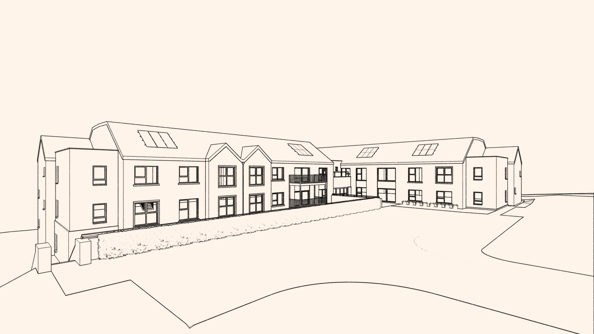 exterior shot make light colour pallete with a modern take add sky with a slightly warm sun and trees in background with grass use cream stonework with darker cladding elements solar panels on roof shown no red brick