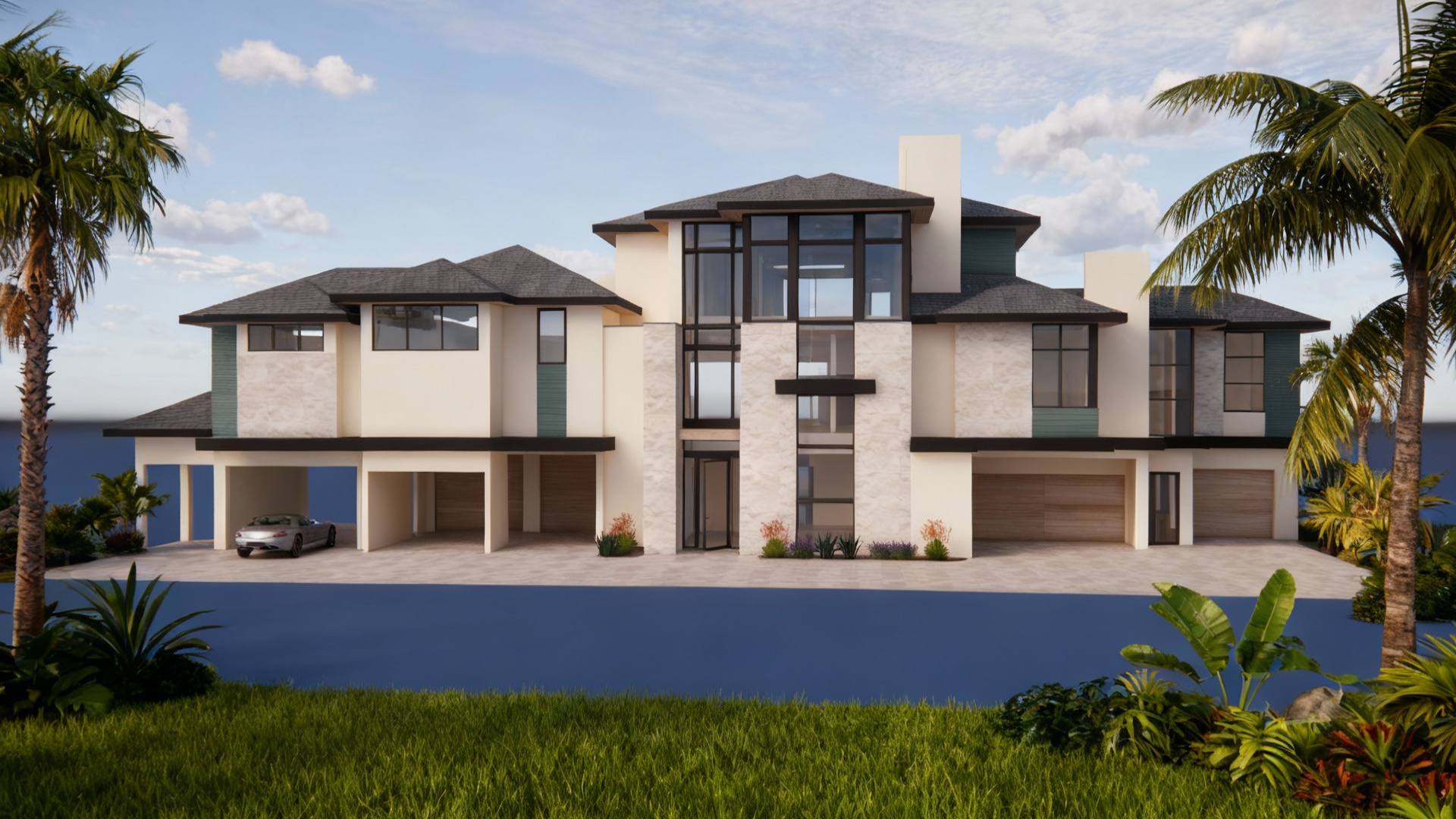 photo realistic florida scene with palm tress and tropical plants grass is in the front and trees and plants on the sides