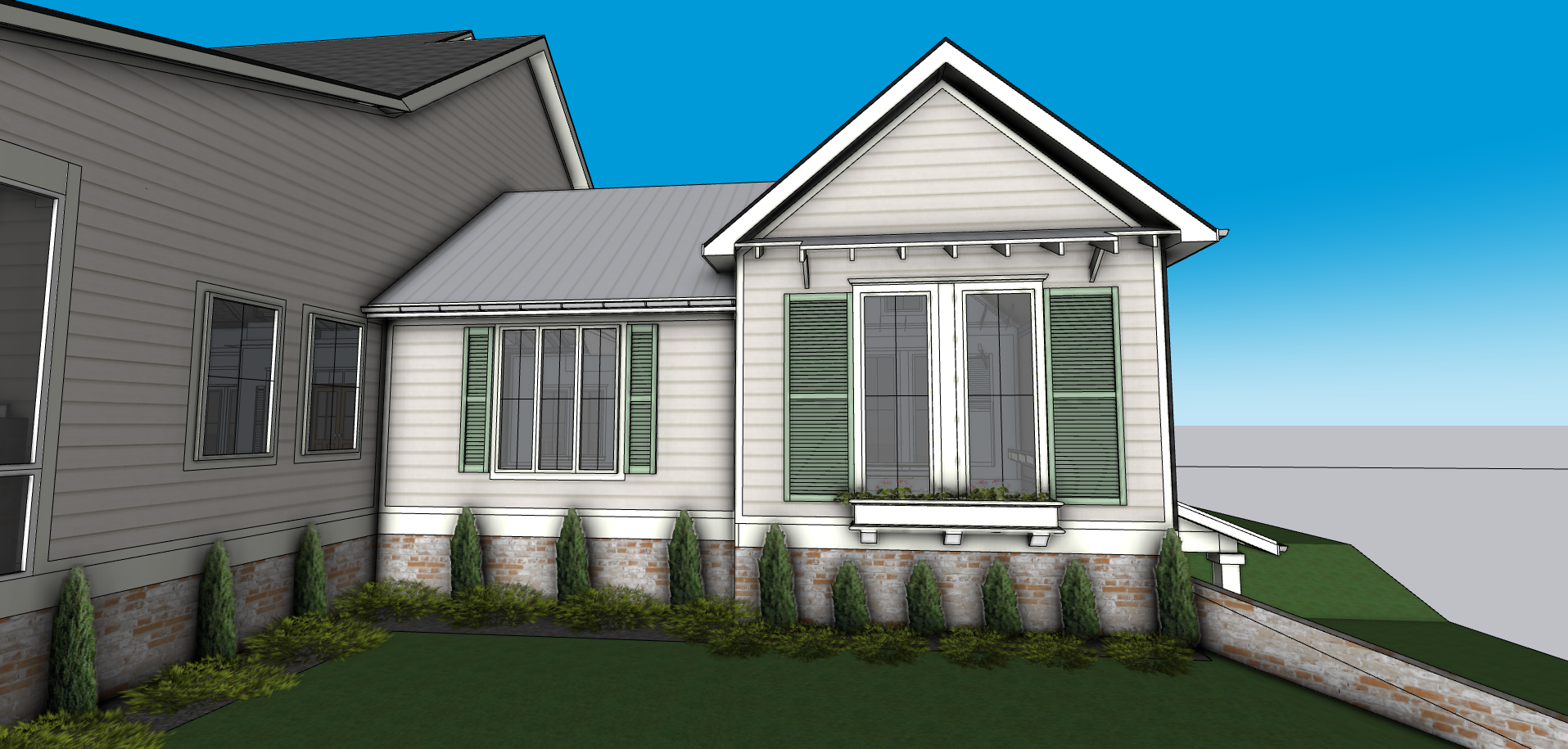 render a picturesque portion of a country house in a serene setting the house features classic white siding with charcoal roofing accented by soft sage green shutters landscaping includes blooming pink and red flowers line the lush garden the sky is bright and clear a vivid blue casting gentle warm sunlight over the scene the expansive lawn is a deep vibrant green