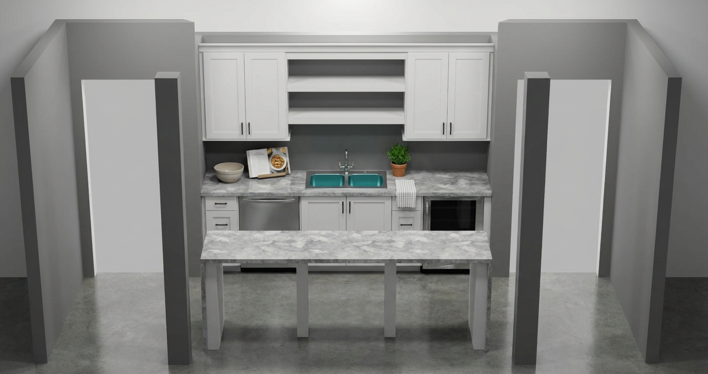 do not change the cabinets in any way preserve the exact cabinet colors materials finishes dimensions door and drawer styles hardware spacing alignment and all geometry exactly as shown do not alter the countertop shape backsplash appliances flooring lighting fixtures or wall structure only remove the construction materials clutter and mess from the scene clean the room and make it look finished and staged add a few simple tasteful home accessories appropriate for the style of the space but do not add or remove any furniture windows or architectural elements maintain the original lighting direction and realism enhance clarity and polish the photo while keeping the cabinetry and room design completely unchanged do not alter the lighting to keep the cabinet colors as they are in the image do not change the walls keep the cabinet layout as shown do not add windows or ceiling just make the image look realistic the cabinet color is a very light grey