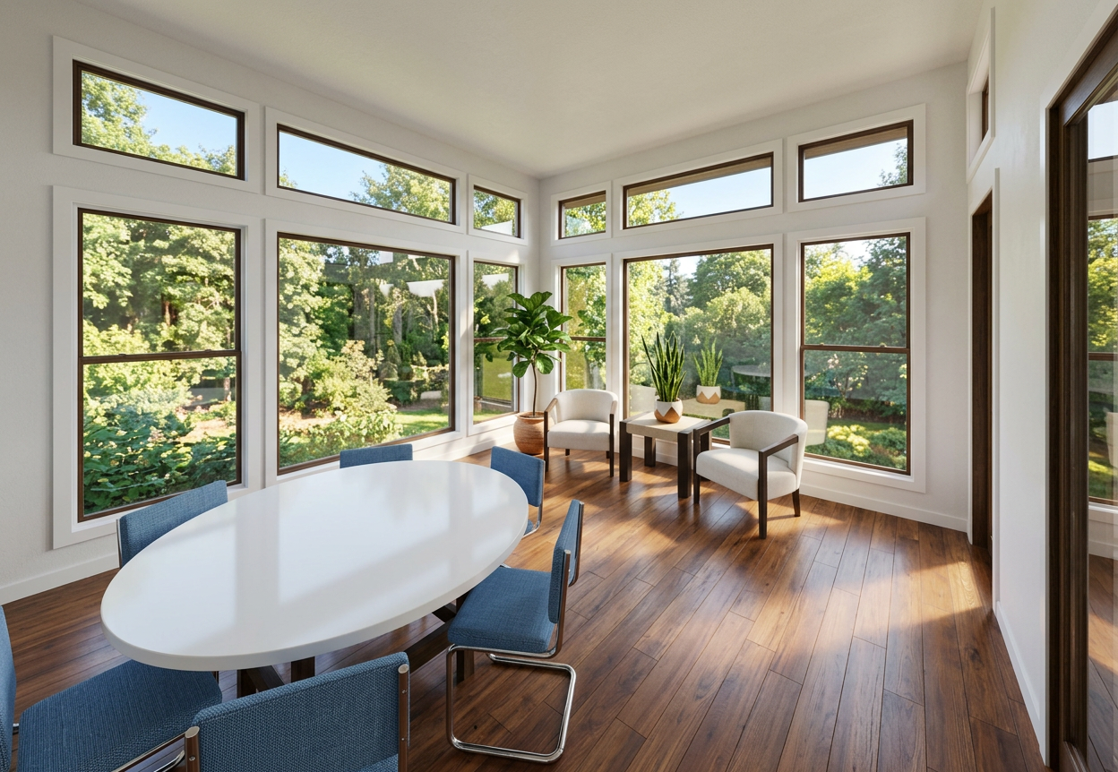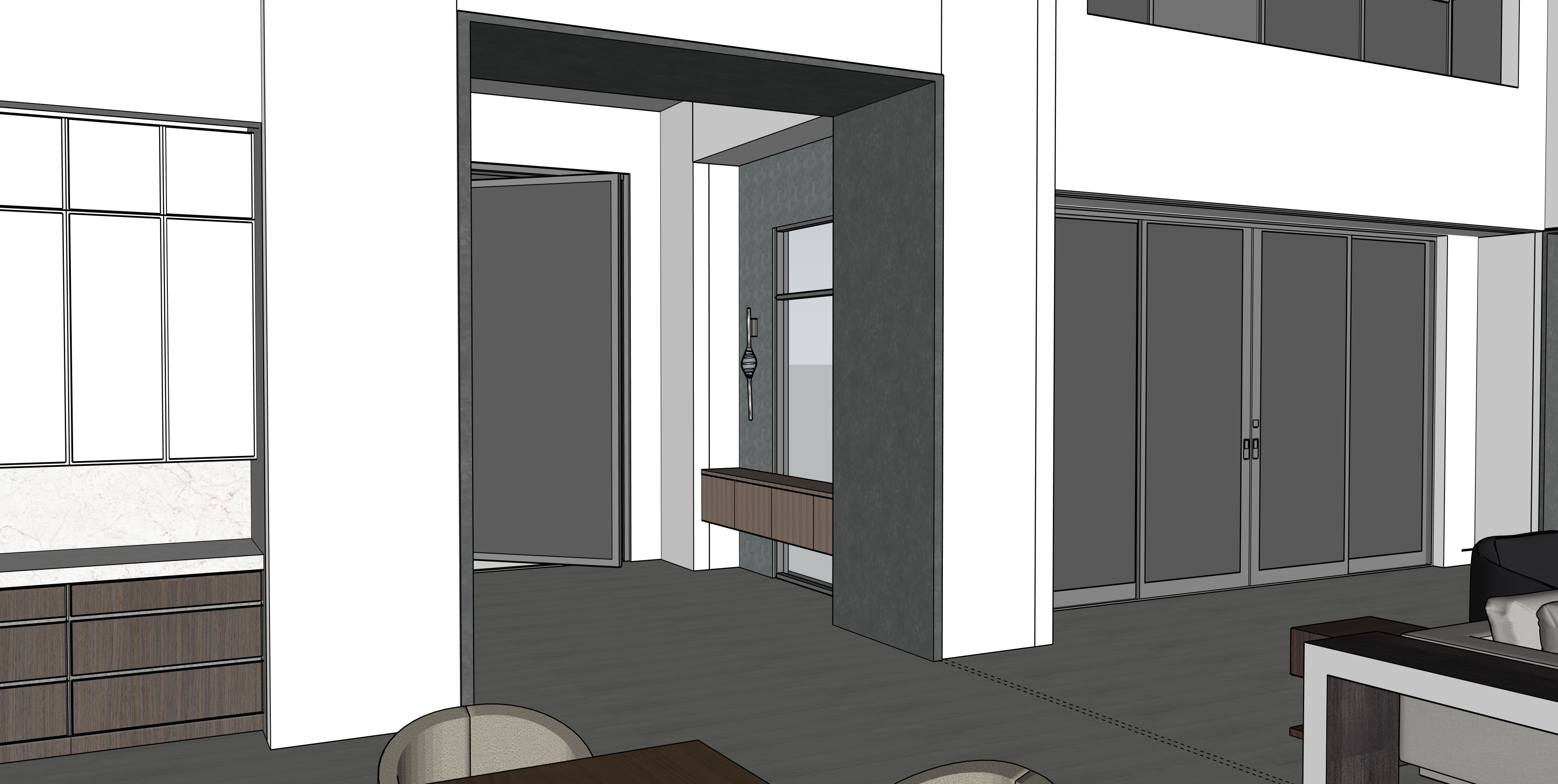 render an elegant modern interior entry featuring a medium gray geometric patterned wall incorporate a sleek metal sconce in a polished silver finish the centerpiece is a floating console with a dark grey wood texture the floor showcases a concrete tile contributing to the sophisticated ambiance use a soft ambient lighting to enhance the contemporary and minimalist atmosphere white walls left is cabinetry with white uppers and grey wood lowers center is a front door with glass and black frame
