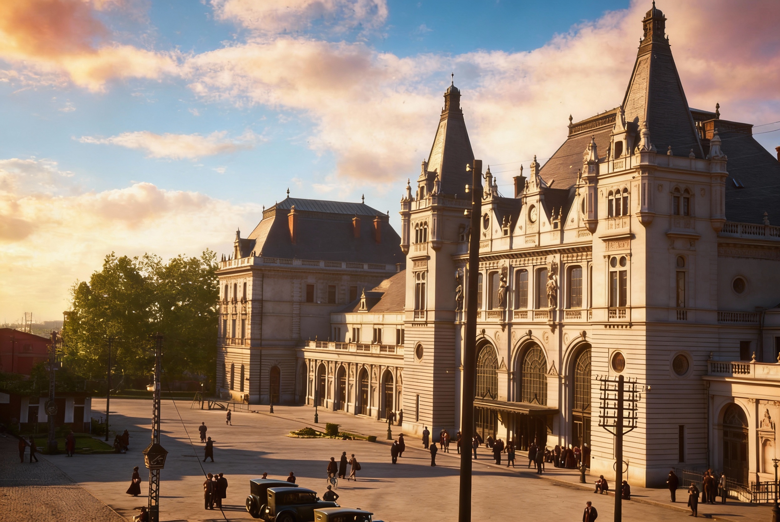 sunny day 1900 s style atmosphere beautyful clouds emove text from top of the picture paved surface aligned to the tram track shiny tramtrack cinematic hyperrealistic render
