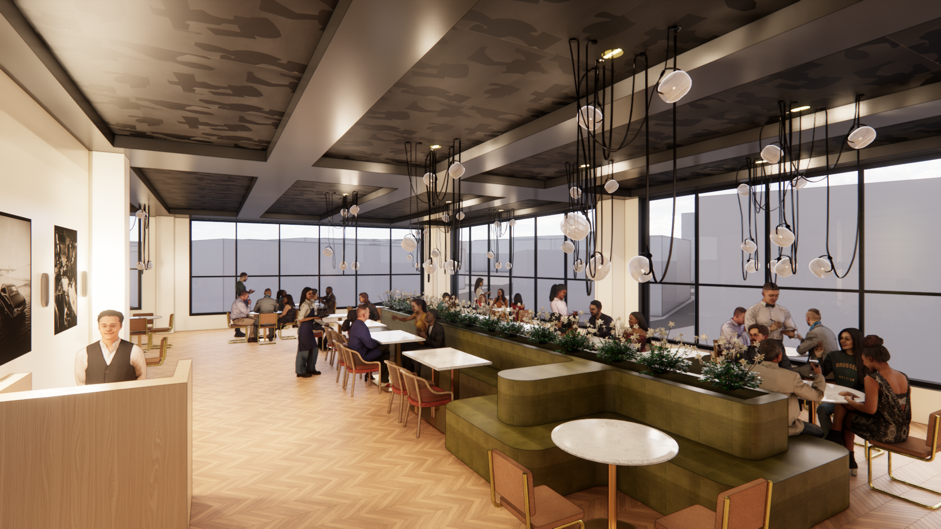 can you help me clean up this image the background out the windows is supposed to be 811 main street in nashville tn 37206 on the second level of the building can you help add in a little more greenery where the plants are to fill it out also can you add some roller shades in a neutral color on the windows make sure they re open so you can see out can you also make the green banquet bench look more realistic it supposed to be velvet finally can you add some food and drink and plates and whatnot to the tables where people are sitting
