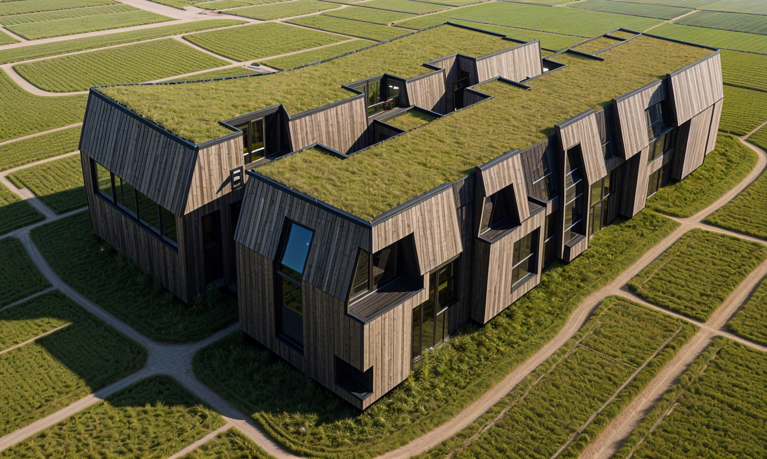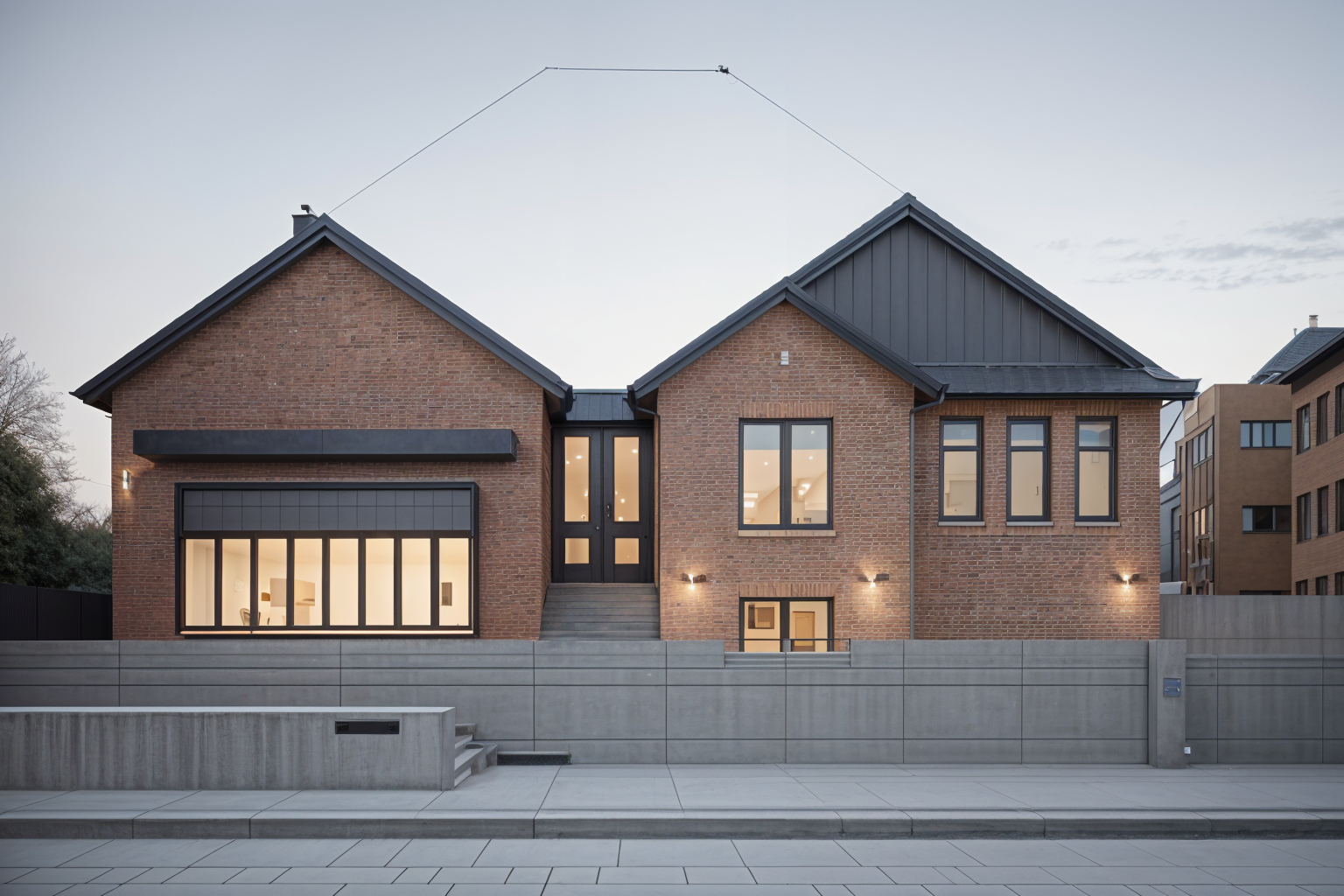 place the building in an urban environment enhancing the projecting volume with additional vertical slit openings integrate sleek modern dormer windows that match the proportions and rhythm of these vertical openings maintaining a cohesive and contemporary architectural expression