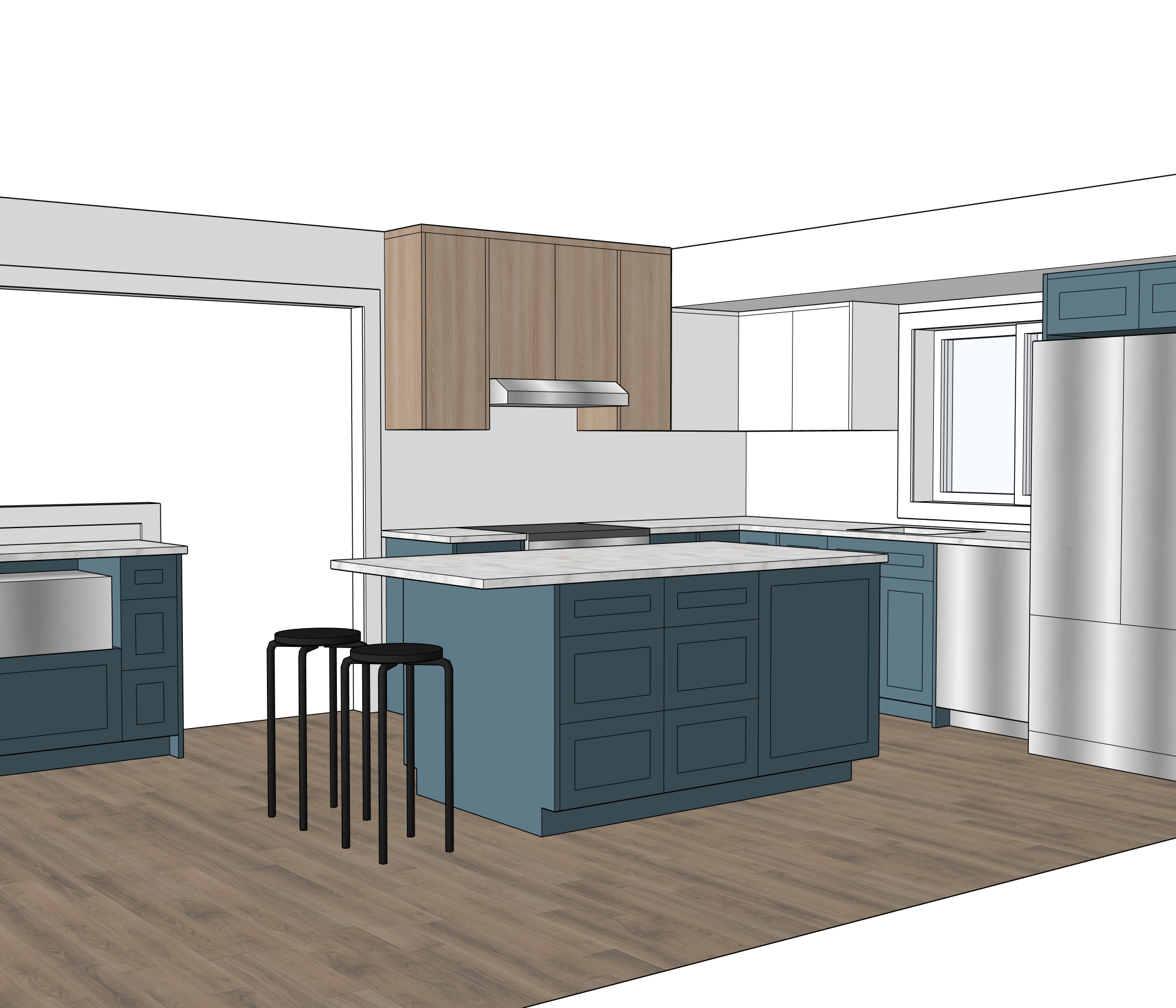add black pulls to the cabinets the lower cabinets have shaker doors the upper cabinets have slab doors show sunlight comin gin from the window on the right and potlights on the kitchen ceiling