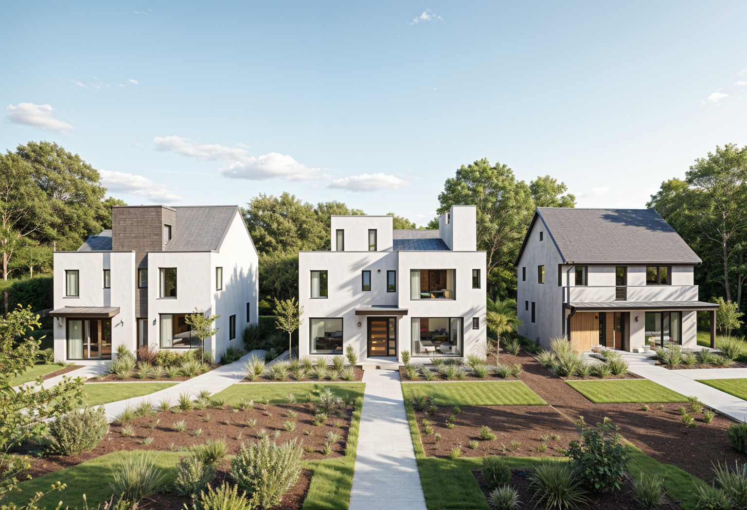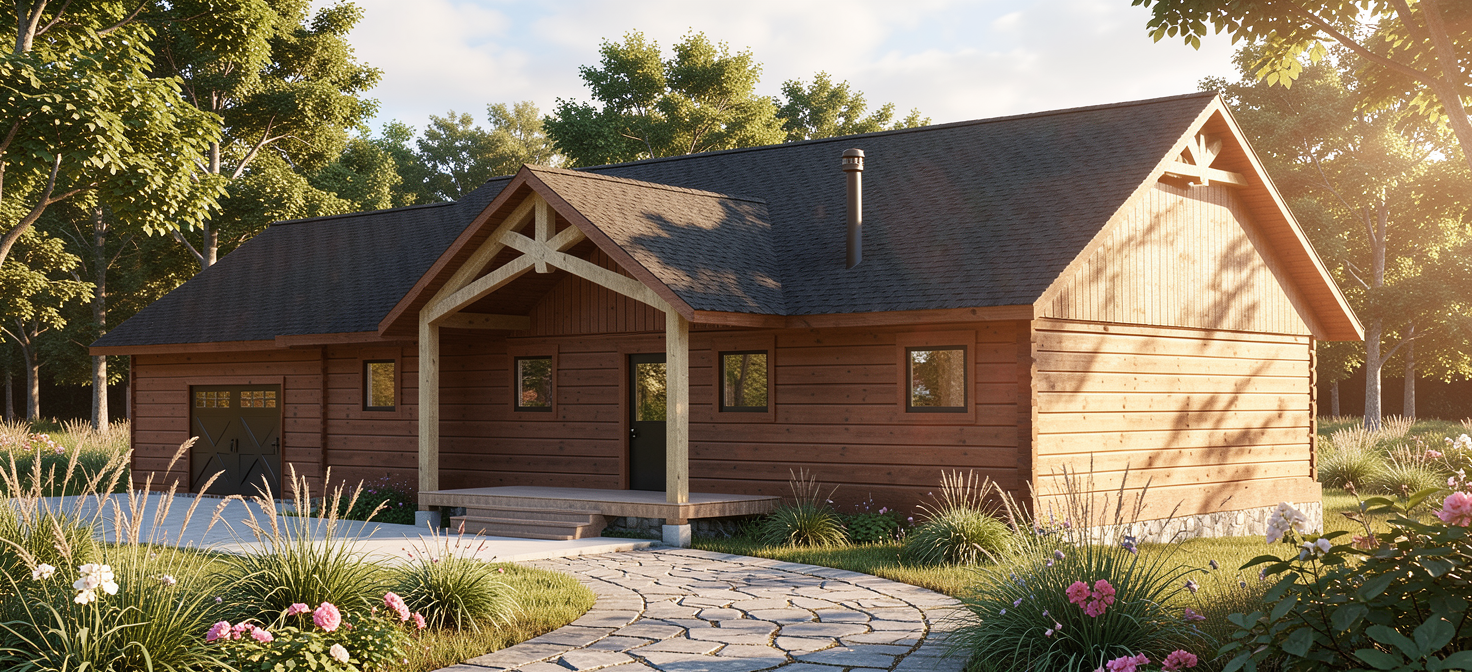 photorealistic rendering daytime blue sky with a couple clouds with soft shadows elevation front view of a guest house situatied on a hillside maintain 2d orthagonal straight on view materials are vertical wood siding with metal roof clear glass with dark mullions interior shown with lights on add natural landscaping around hillsie planting with sparse shrubs and plants