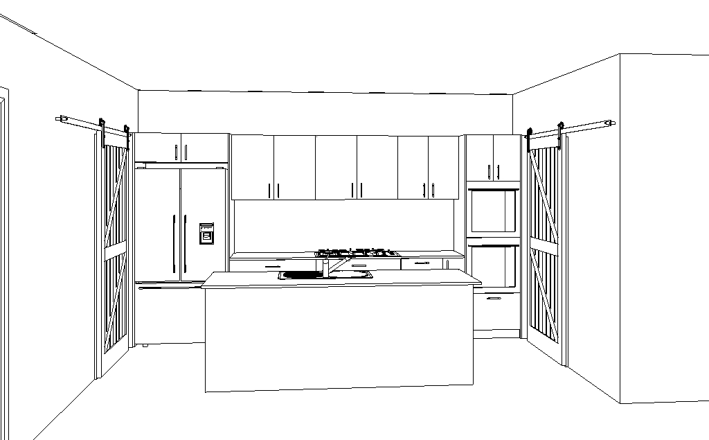 marble benchtops sage colored cabinets solid timber barn doors timber floor white walls ceiling stainless steel appliances two pendant lights over island bench