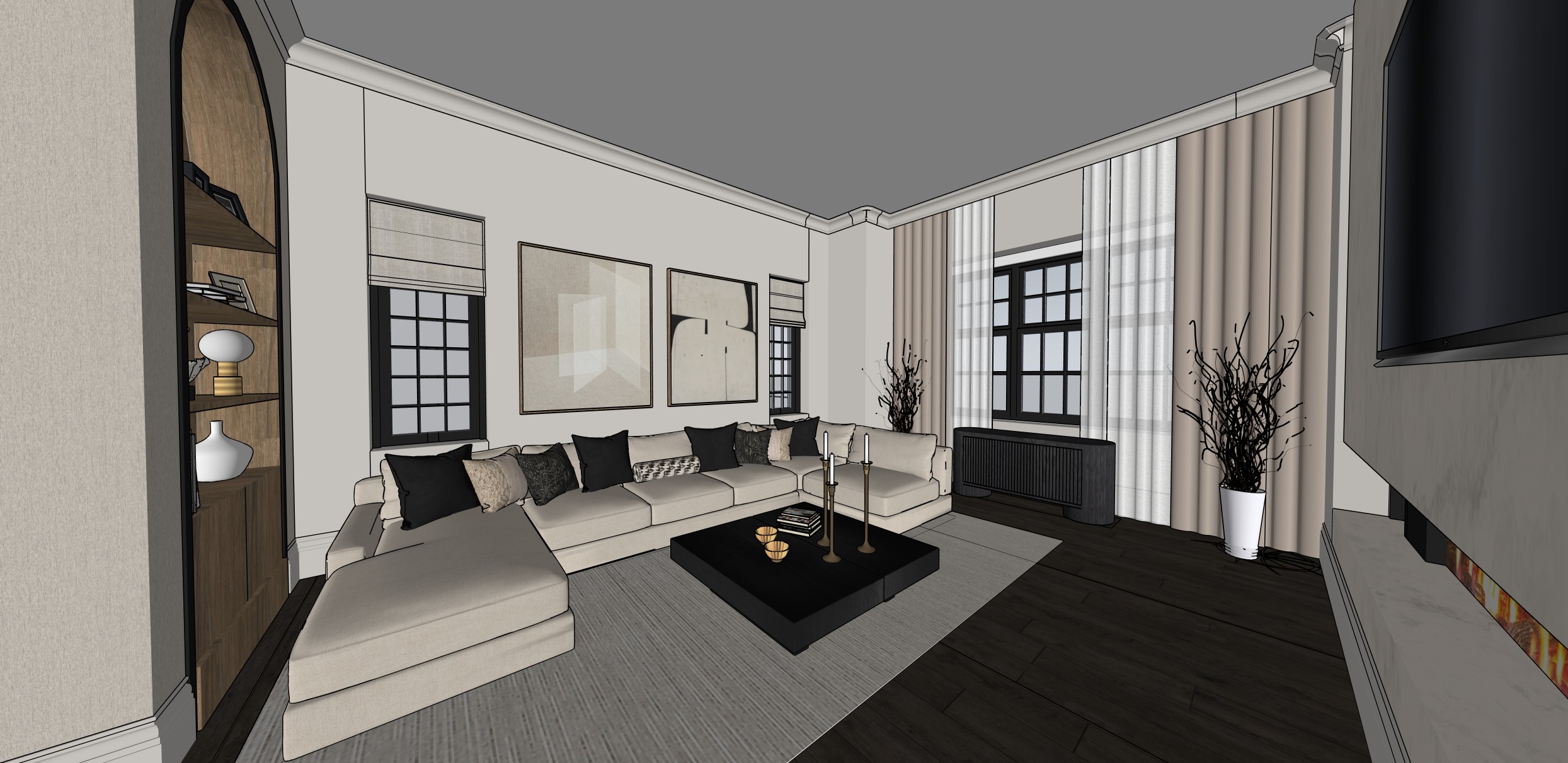 a warm cosy living room with a rich dark wood floor and textured beige rug soft halo perimeter lighting around coving warm toned wood used within the shelf and soft beige curtains infront of the window finished with a fireplace glowing