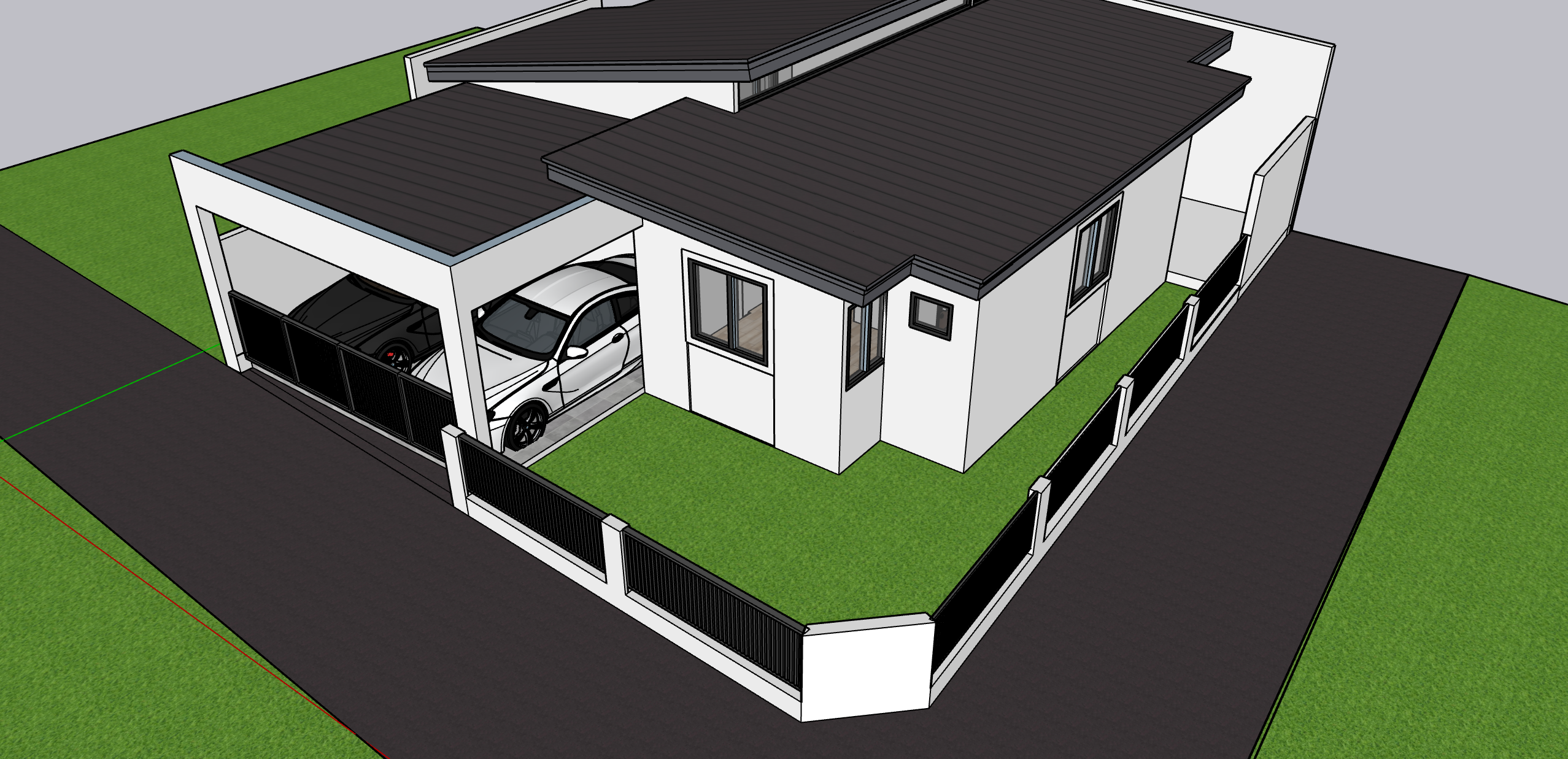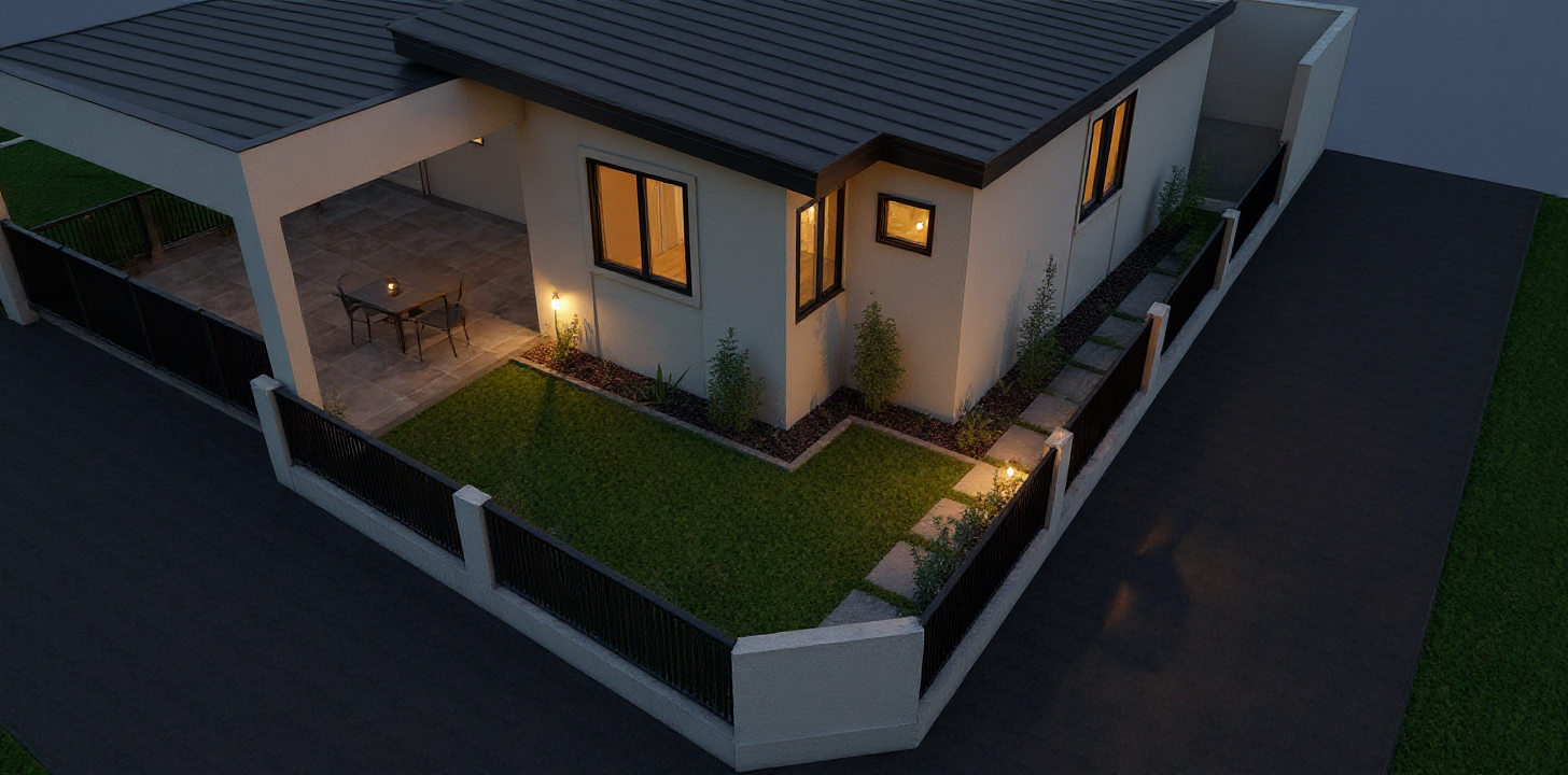 develop a landscaped garden within the fence filled with lush plants and greenery add a clear pathway with integrated pathway lights create a bright ambient daylight setting with natural well defined shadows for depth and realism make it a japanese garden with concrete blocks path way with the fence only