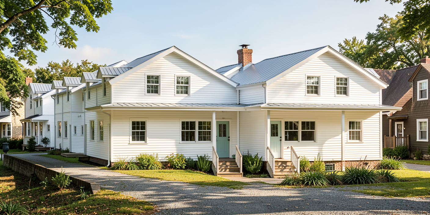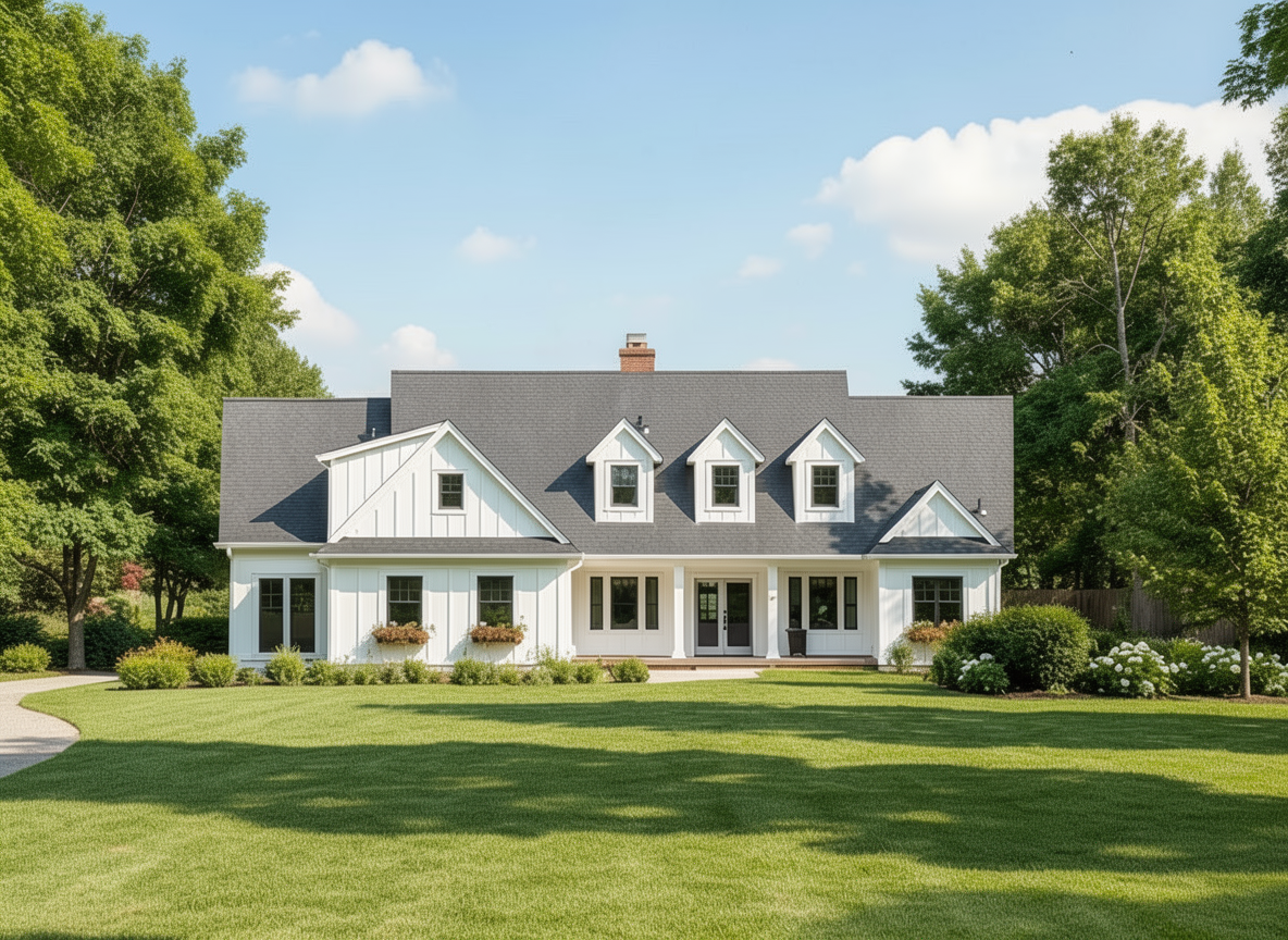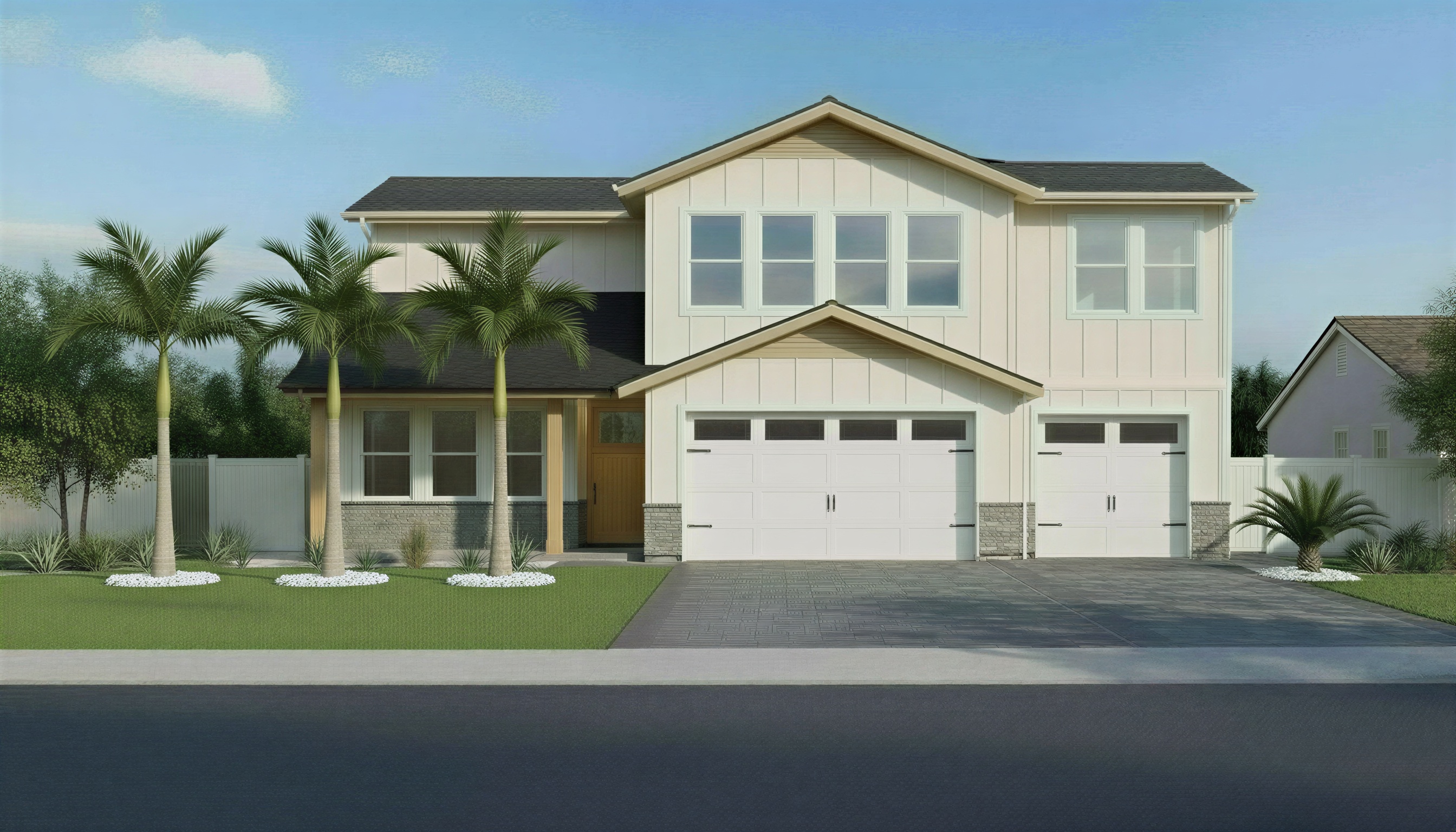 change the exterior siding paint color to sherwin williams alabaster sw 7008 a warm soft white with subtle cream undertone keep trim wood accents stone roof windows and garage doors unchanged adjust all palm trees and the sago palm to newly planted juvenile size approximately 2 feet tall very small trunks compact fronds nursery scale proportions keep exact placement and white rock rings do not change architecture driveway or landscaping layout neutral daylight realistic residential rendering