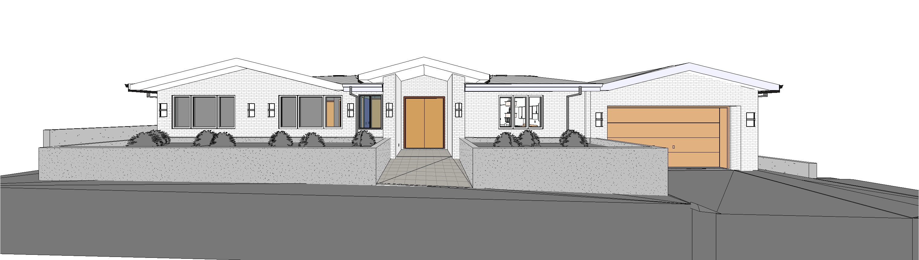 make door and windows frames black exterior walls all white brick veneer black roof fascia street on the front 1 story houses on both sides