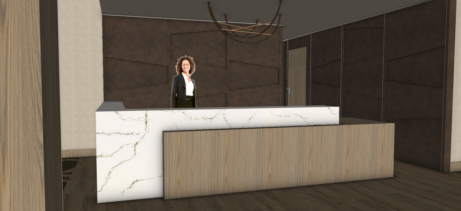 a modern minimalist reception desk design medium oak flooring complements a light wood grained reception desk an led lit back wall with lit details the atmosphere is calm and relaxing the lighting is soft and natural creating a relaxing spa like atmosphere the back wall is illuminated by led strips washing down from the ceiling and from each detailed niche